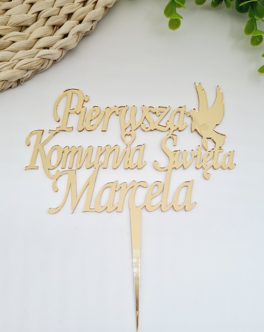 Stylowy topper na tort z okazji Pierwszej Komunii Świętej wykonany z złotej plexi. Pięknie błyszczy, dodając tortowi elegancji i wyjątkowego charakteru. Posiada napis „Pierwsza Komunia Święta” oraz personalizowane imię dziecka. Delikatny motyw gołąbka symbolizuje pokój i duchowość. Idealna ozdoba na tort komunijny i pamiątka na lata. Dostępny także w wersji srebrnej, białej lub drewnianej.