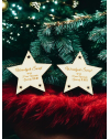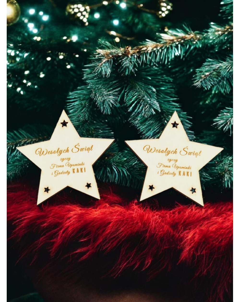 Drewniana bombka w kształcie gwiazdki to drobny upominek dla firm na świąteczny upominek.