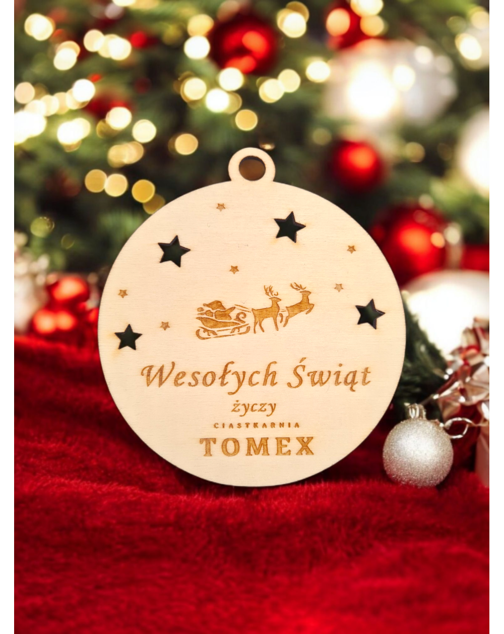 Drewniana bombka z wygrawerowanymi życzeniami to ekologiczny upominek dla kontrahentów firmowych.