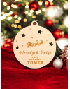 Nie zapomnij zapisać swojej personalizacji, aby móc dodać ją do koszykaTa piękna, drewniana bombka o wymiarach 9,6 cm wysokości i 8,6 cm szerokości to doskonały świąteczny upominek, który zachwyci każdego klienta. W centralnej części ozdoby znajduje się szczegółowy grawerunek przedstawiający Świętego Mikołaja (Gwiazdora) w saniach ciągniętych przez renifery, wprowadzający ciepły i przyjemny klimat świąt. Dodatkowo, wygrawerowane życzenia „Wesołych Świąt życzy [Nazwa Firmy]” dodają osobistego charakteru i podkreślają troskę o odbiorców.