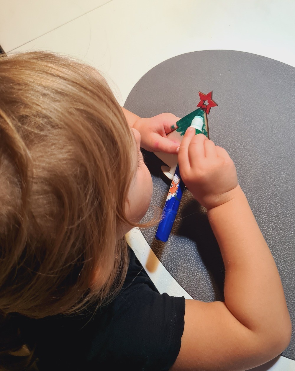 Powierzchnia sklejki jest przyjemna w dotyku i łatwo przyjmuje różne rodzaje kleju, więc mali artyści mogą tworzyć na niej wyjątkowe, świąteczne wzory i dekoracje.