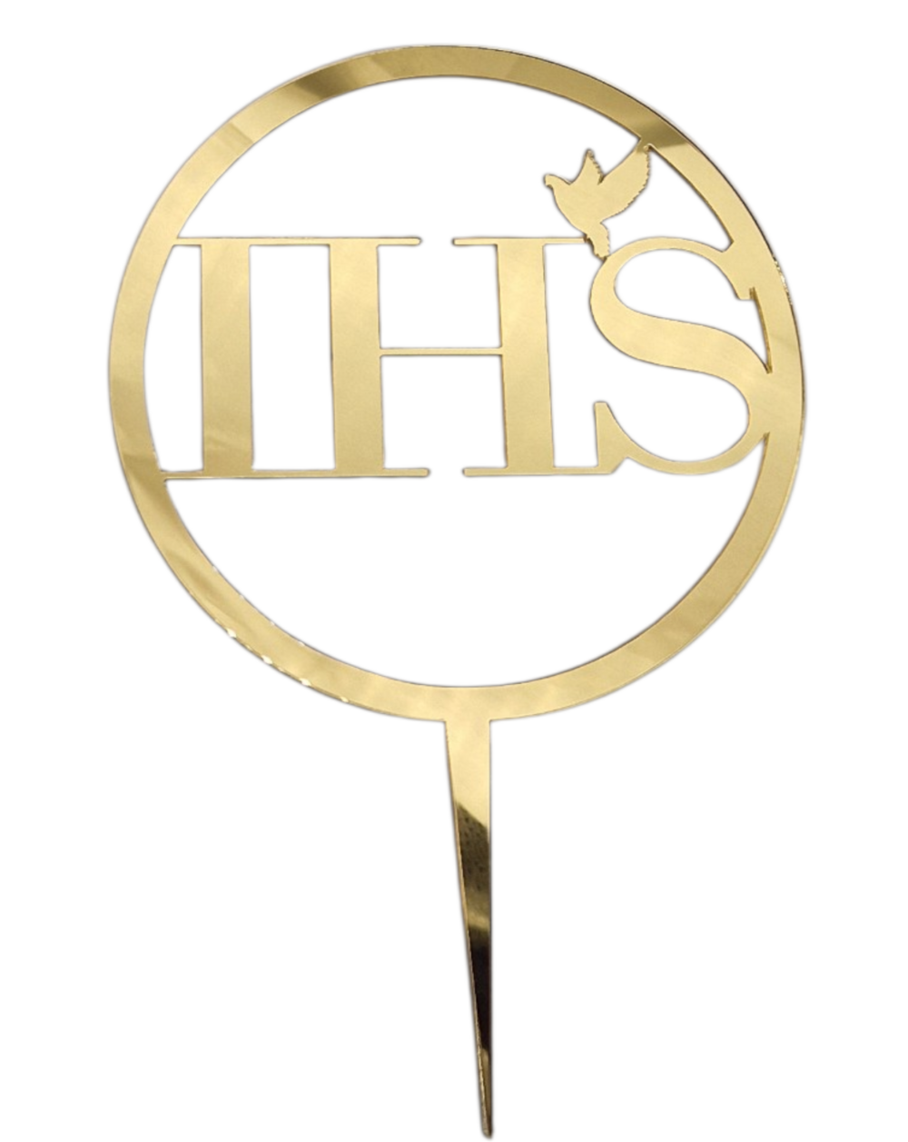 Elegancki topper na tort komunijny IHS o średnicy 14 cm z motywem gołąbka. Wybierz idealne wykończenie dla swojego tortu: luksusową pleksi lustrzaną (złotą lub srebrną), klasyczną białą pleksi lub naturalną drewnianą sklejkę. Wyposażony w stabilną nóżkę 7,5 cm, gwarantuje perfekcyjną prezentację na każdym wypieku.