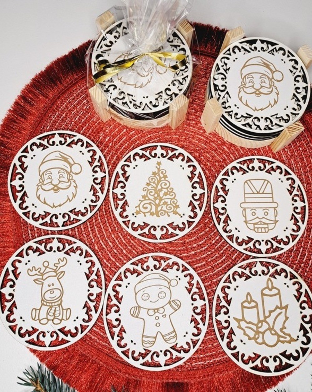 Drewniane, białe podkładki pod kubki to doskonały wybór na świąteczne dekoracje, subtelnie podkreślający atmosferę Bożego Narodzenia. Wykonane z wytrzymałego drewna i zabezpieczone białą farbą do drewna, są odporne na wilgoć i codzienne użytkowanie, zachowując przy tym elegancki wygląd. Podkładki wyróżniają się ażurowym wzorem po bokach, który dodaje im lekkości i stylu, a ich środek zdobią precyzyjnie wygrawerowane świąteczne motywy, takie jak gwiazdor, renifer, choinka, piernikowy ludzik, dziadek do orzechów oraz świeczki. Każdy grawerowany wzór jest starannie wykonany, nadając podkładkom wyjątkowego, świątecznego charakteru.