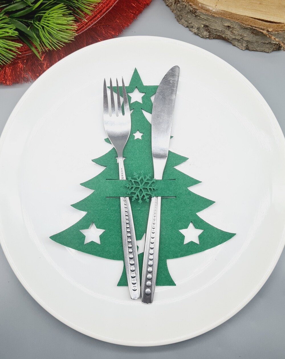 Filcowe etui na sztućce w kształcie zielonej choinki to wyjątkowa ozdoba, która doda uroku bożonarodzeniowej aranżacji.