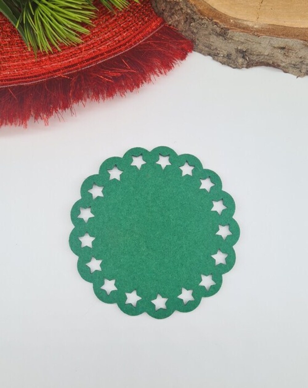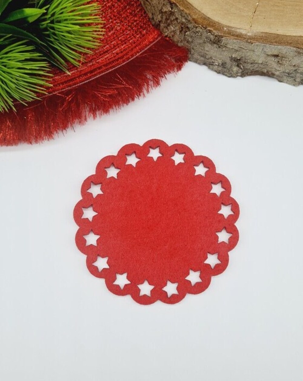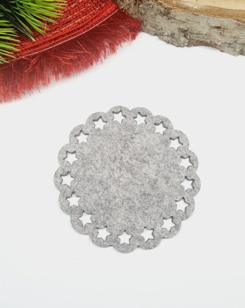 Filcowe podkładki pod kubki to uroczy i praktyczny dodatek na świąteczny stół, dostępny w trzech kolorach do wyboru: czerwonym, zielonym i szarym. Okrągłe podkładki ozdobione są delikatnymi wycięciami w kształcie gwiazdek, które dodają im subtelności i świątecznego charakteru. Każda z podkładek stanowi idealne miejsce na kubek z herbatą czy kawą, chroniąc jednocześnie powierzchnię stołu przed śladami po napojach. Ciepły, filcowy materiał i klasyczne kolory wprowadzą przytulny nastrój, pięknie dopełniając bożonarodzeniową aranżację wnętrza.