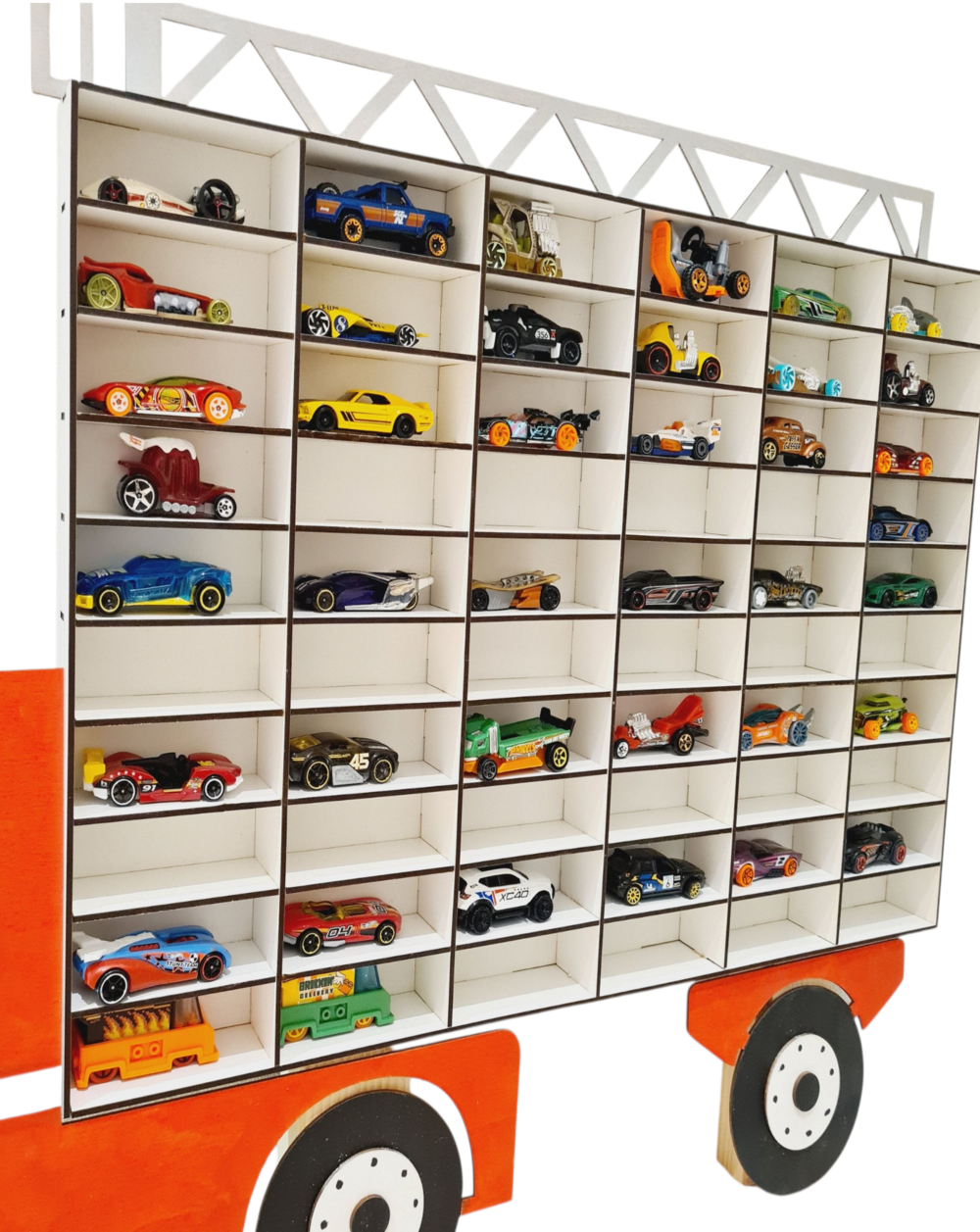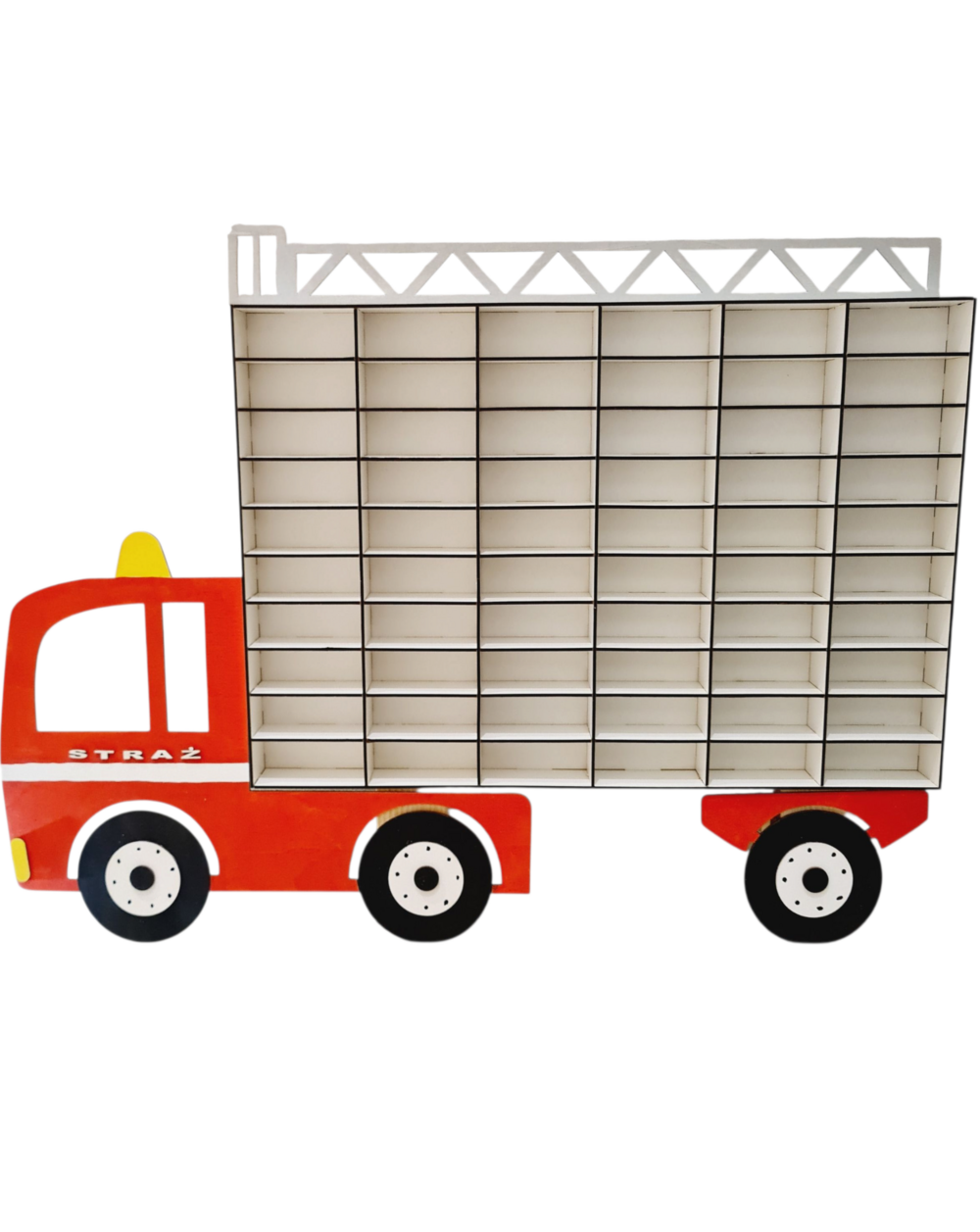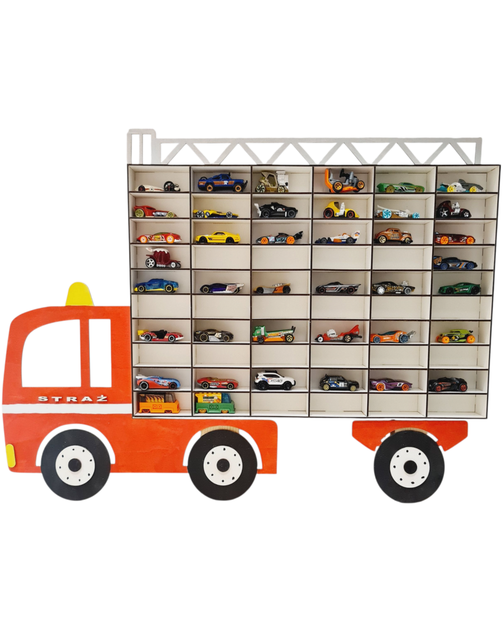Organizer na resoraki w stylu strażackim to praktyczne i dekoracyjne rozwiązanie dla młodych miłośników motoryzacji i pojazdów ratunkowych. Półka wykonana jest z białej płyty HDF, co gwarantuje jej lekkość, trwałość i nowoczesny wygląd. Składa się z 60 przegródek, idealnie dopasowanych do przechowywania samochodzików takich jak resoraki, co pozwala na wygodne uporządkowanie kolekcji.