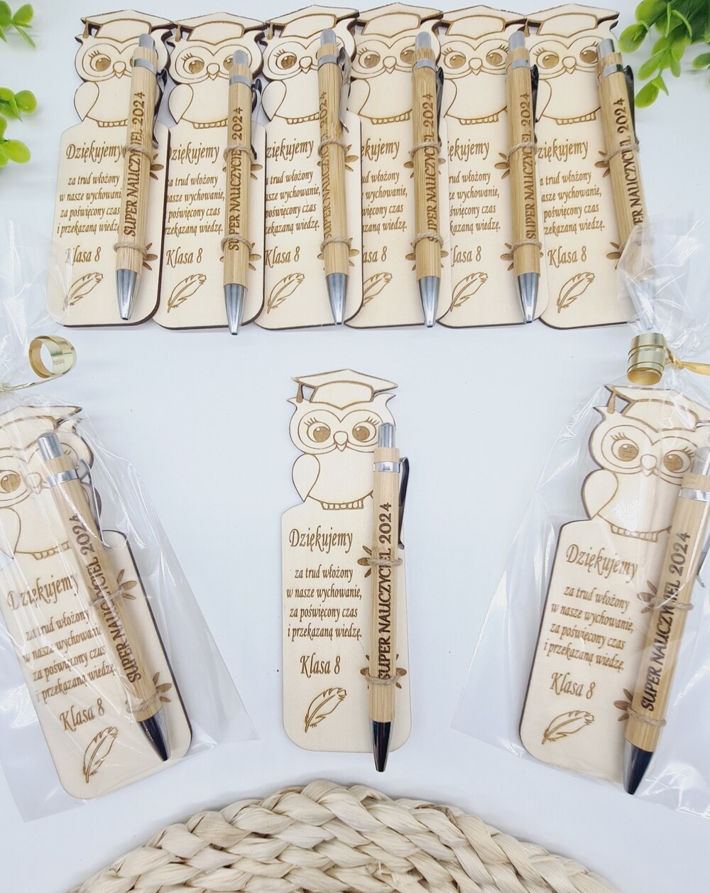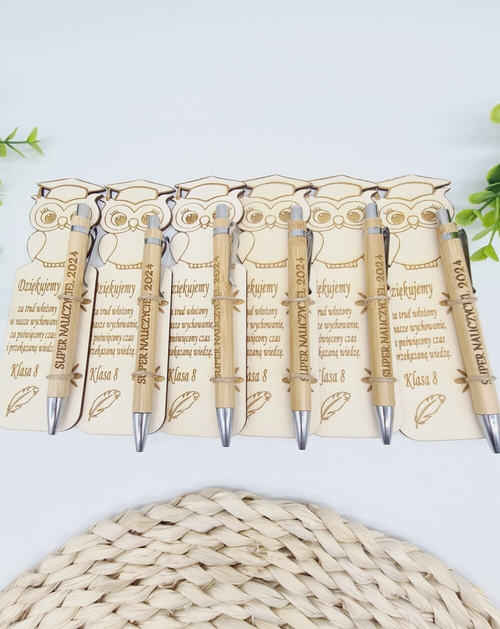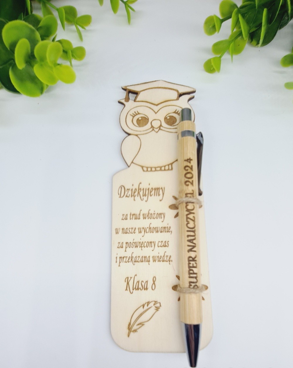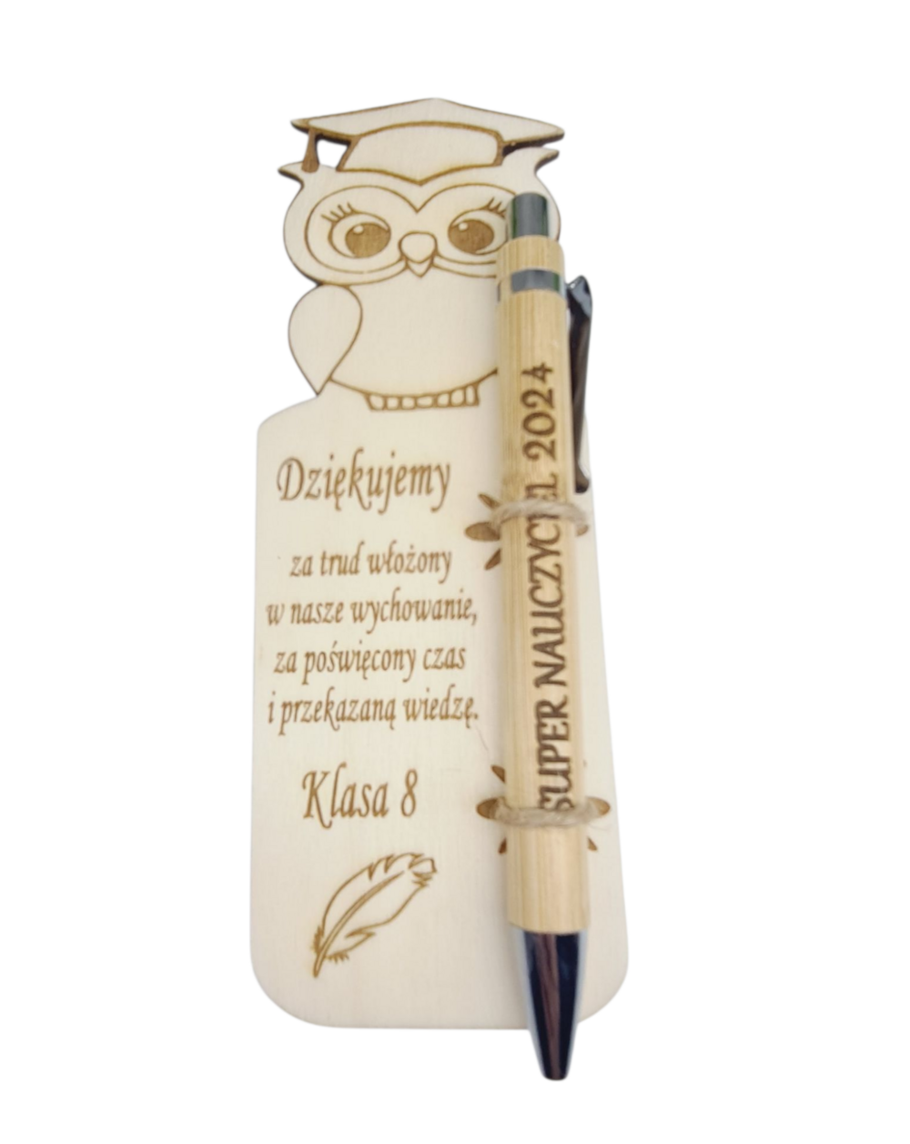 Nie zapomnij zapisać swojej personalizacji, aby móc dodać ją do koszykaWyjątkowy zestaw upominkowy idealny jako podziękowanie dla nauczyciela - drewniana zakładka do książki z motywem sowy oraz przyczepionym długopisem. Specjalnie przygotowana na zakończenie roku szkolnego lub Dzień Nauczyciela jako wyrażenie wdzięczności za trud i zaangażowanie włożone w nauczanie. To również praktyczny i estetyczny upominek, który nauczyciel może używać na co dzień, pamiętając o uczniach, którzy go doceniają. Prezentowana zakładka z długopisem to sposób, aby wyrazić swoje uznanie, dając coś, co nauczyciel będzie mógł używać z dumą każdego dnia.