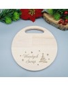 Okrągła, solidna deska z klejonego drewna bukowego o średnicy 23,5 cm i grubości 1,9 cm. Z grawerem "Wesołych Świąt" oraz delikatnymi reniferami i gwiazdkami, doskonale sprawdzi się jako praktyczny i świąteczny prezent.