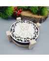 Podkładki mają średnicę około 9,5 cm, co sprawia, że są idealne do użytku pod kubki czy szklanki. Sprzedawane są w zestawie po 6 sztuk i zapakowane w solidny drewniany stojak, który ułatwia przechowywanie i pięknie prezentuje się na stole. To nie tylko praktyczny element wyposażenia, ale również świetny pomysł na prezent dla bliskich.