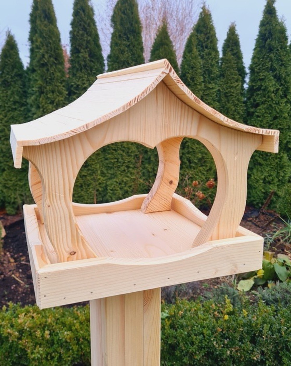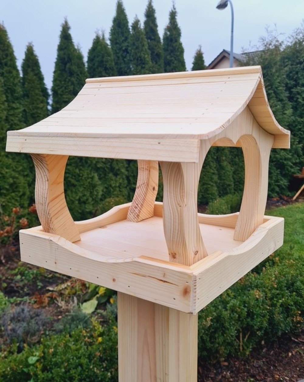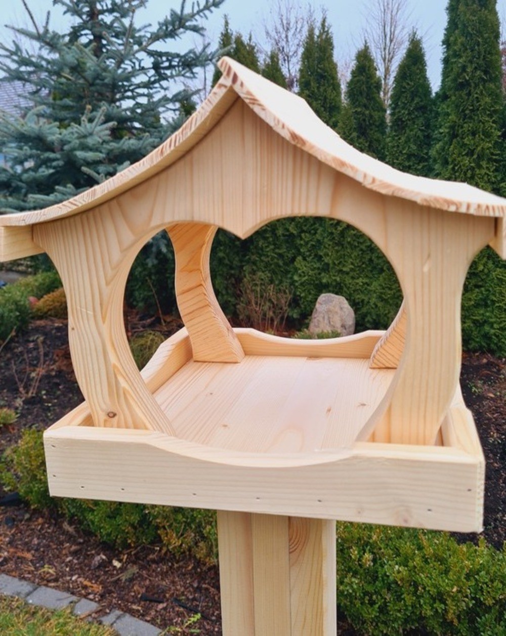 Karmnik dla ptaków XXL o wymiarach 29 cm x 28,5 cm x 26 cm to solidna i trwała konstrukcja wykonana z wysokiej jakości drewna świerkowego. Wyróżnia się precyzyjnie wyciętymi kształtami, które nadają mu estetyczny i elegancki wygląd, a także dwuspadowym dachem o niestandardowym designie, skutecznie chroniącym karmę przed deszczem i śniegiem. Karmnik najlepiej sprawdzi się ustawiony na pniu drzewa, gdzie po odpowiednim przymocowaniu zapewni ptakom stabilne i bezpieczne miejsce do spożywania pokarmu. Idealny do ogrodu lub przestrzeni naturalnych, stanowi funkcjonalny i dekoracyjny element.