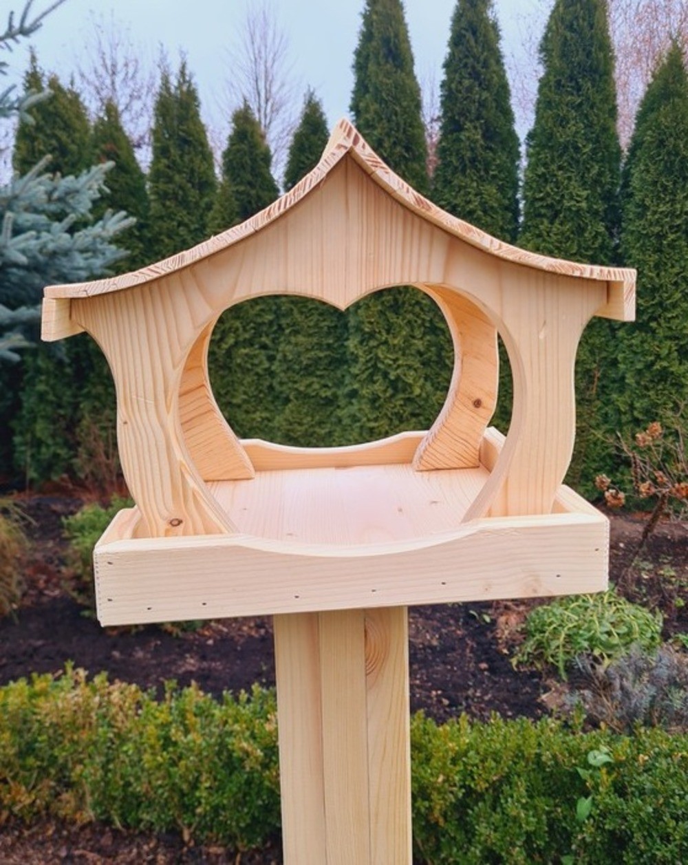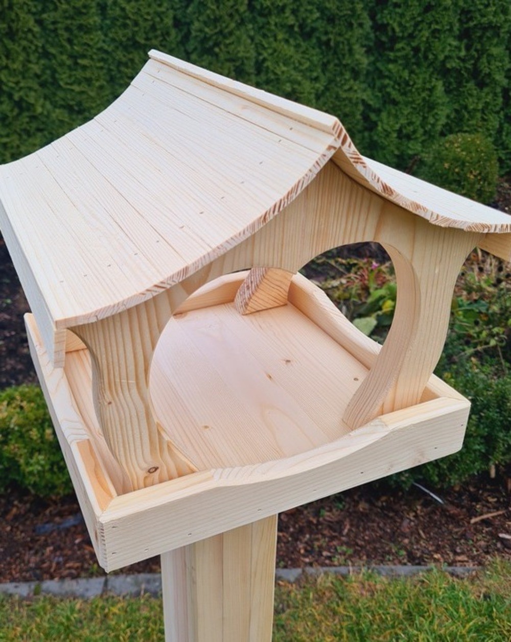 Karmnik dla ptaków XXL o wymiarach 29 cm x 28,5 cm x 26 cm to wyjątkowy model wykonany z solidnego drewna świerkowego, wyróżniający się precyzyjnie wyciętymi detalami. Dwuspadowy dach o niestandardowym kształcie dodaje mu uroku, a konstrukcja przeznaczona do ustawienia na pniu wymaga przymocowania dla stabilności.