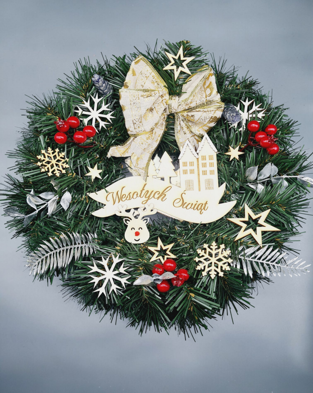 W centrum wianka znajduje się świąteczny napis „Wesołych Świąt” wykonany z drewna. Napis jest elegancko wkomponowany w całość, nadając wiankowi unikalny charakter i personalizację. Dodatkowo, całość wzbogacona o listki srebrne i czerwone gałązki jarzębiny.