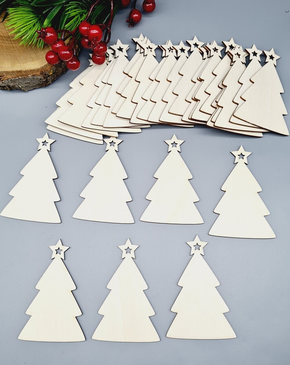 Drewniane choineczki wykonane z naturalnej drewnianej sklejki to doskonały wybór do kreatywnych prac plastycznych, zwłaszcza dla dzieci. Te urocze dekoracje mają wysokość około 10 cm, co czyni je poręcznymi i łatwymi do ozdobienia. W każdej choineczce znajduje się dziurka, umożliwiająca ich zawieszenie na świątecznej choince po udekorowaniu.