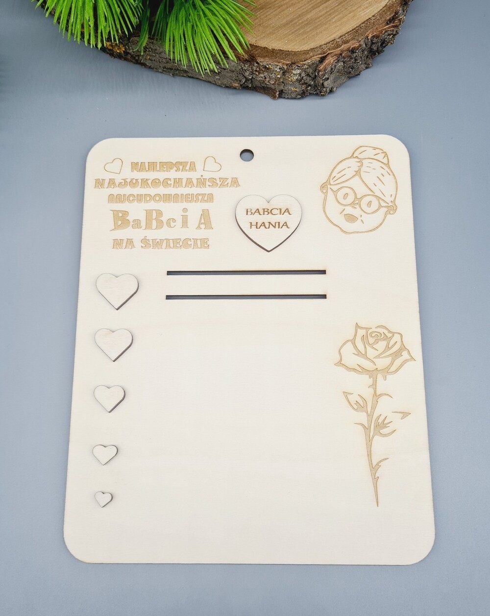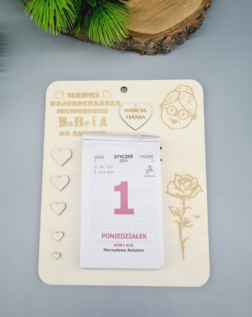 Drewniana podkładka pod kalendarz zdzierak to elegancki i praktyczny prezent dla Babci, z możliwością personalizacji poprzez grawer imienia lub dedykacji.
