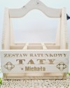 - Personalizowany grawer: skrzynka ozdobiona jest napisem "Zestaw ratunkowy taty" oraz imieniem taty, co nadaje jej wyjątkowy i osobisty charakter.