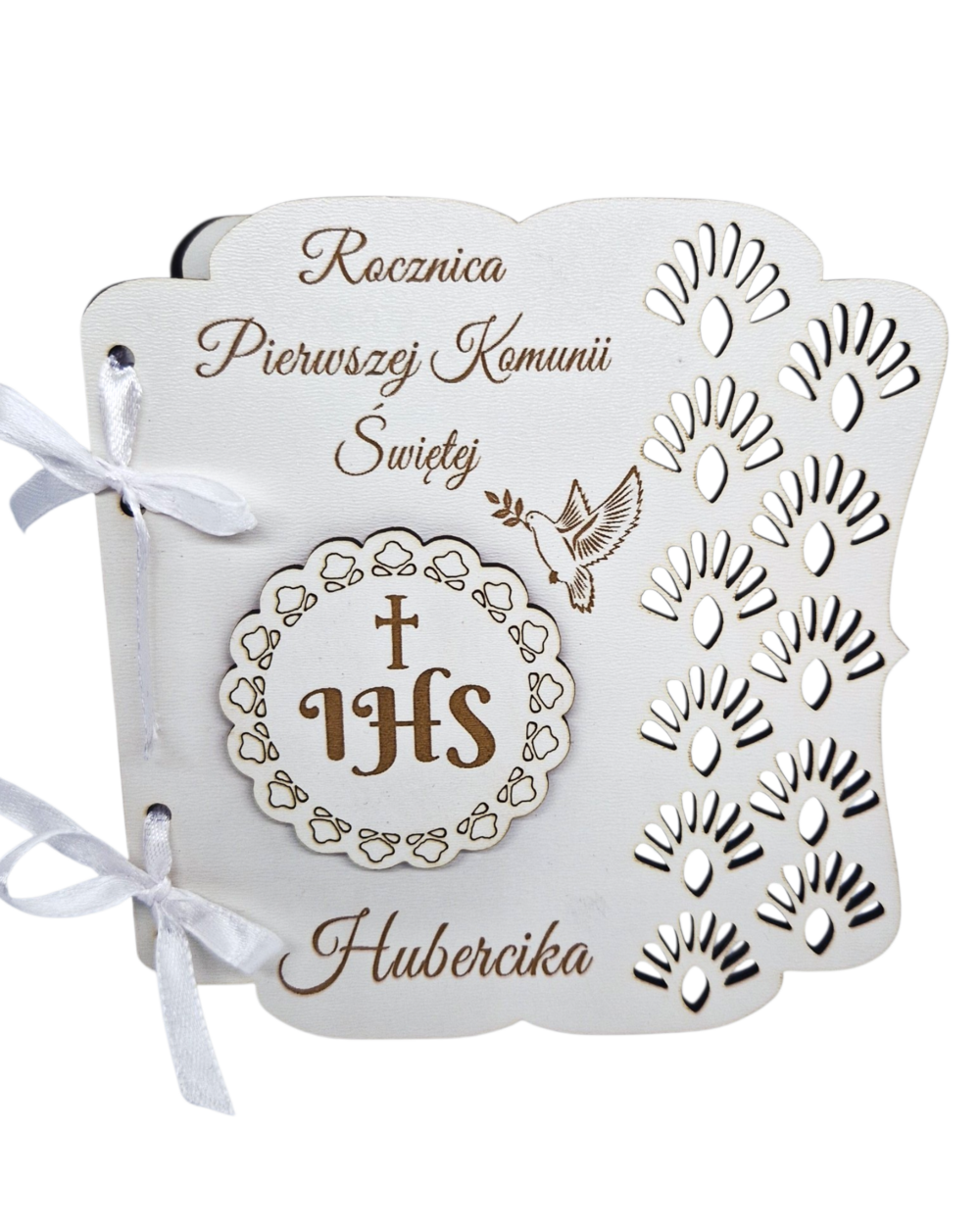 Kartka na rocznicę Pierwszej Komunii Świętej wykonana z płyty HDF z ażurowym wzorem i symboliką hostii, o wymiarach 14x14 cm, zawiera napis „Pamiątka Rocznicy Pierwszej Komunii Świętej” na górze oraz imię osoby obdarowanej na dole. Wewnątrz znajdują się życzenia, a pod nimi podpis osoby składającej gratulacje, a całość dopełnia elegancka koperta.