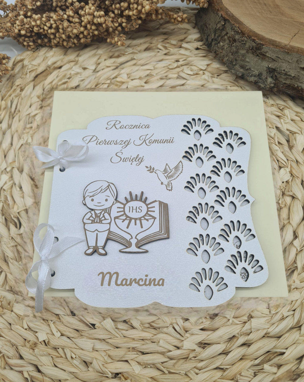 Nie zapomnij zapisać swojej personalizacji, aby móc dodać ją do koszykaKartka na rocznicę Pierwszej Komunii Świętej wykonana jest z trwałej płyty HDF, ozdobiona pięknym ażurowym wzorem na boku, który dodaje jej elegancji. Na froncie znajduje się grafika przedstawiająca chłopca z hostią, otwartą księgą i gołąbkiem, symbolizującym czystość i duchową obecność.