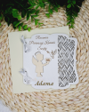 Kartka na rocznicę Pierwszej Komunii Świętej z płyty HDF ozdobiona jest ażurowym wzorem, aniołkiem trzymającym serduszko z napisem IHS oraz grafiką gołąbka, a jej personalizacja imieniem dziecka sprawia, że jest wyjątkowa. Wymiary kartki to 14 cm x 14 cm, a dwie strony połączone wstążeczką, dopełnia dopasowana koperta, tworząc elegancką pamiątkę z życzeniami i podpisem.