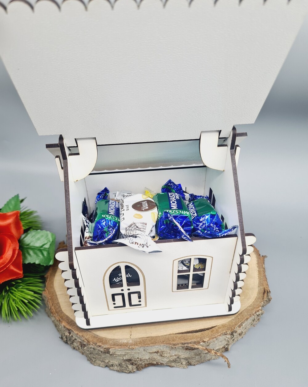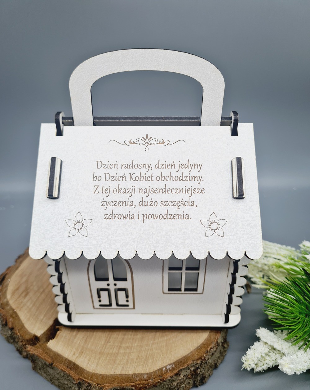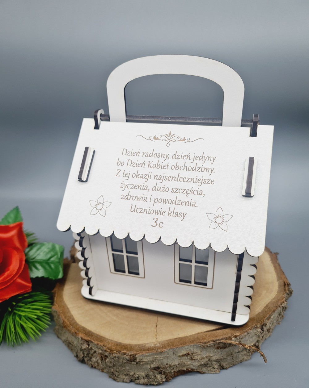 „Słodka chatka” to domek na cukierki wykonany z płyty HDF o wymiarach 18 cm wysokości i 13x13 cm podstawy. Na tylnej ściance znajduje się wierszyk z życzeniami na Dzień Kobiet, co czyni ten upominek uroczym i wyjątkowym gestem dla każdej kobiety.