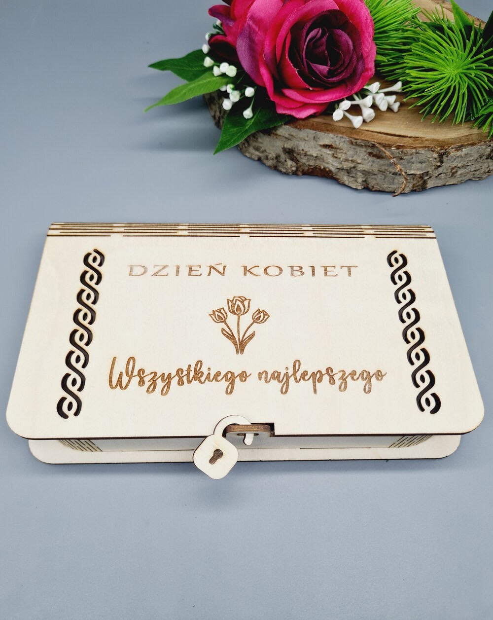 Drewniane pudełko o wymiarach 18,5 cm x 12 cm x 2,5 cm, z grawerem „Dzień Kobiet” i „Wszystkiego najlepszego” oraz subtelnym bukietem kwiatów pośrodku, to elegancki upominek na Dzień Kobiet. Wieczko zdobi delikatny ażurowy wzór, a całość stanowi wyjątkowy gest dla mamy, babci, żony czy koleżanek z pracy.
