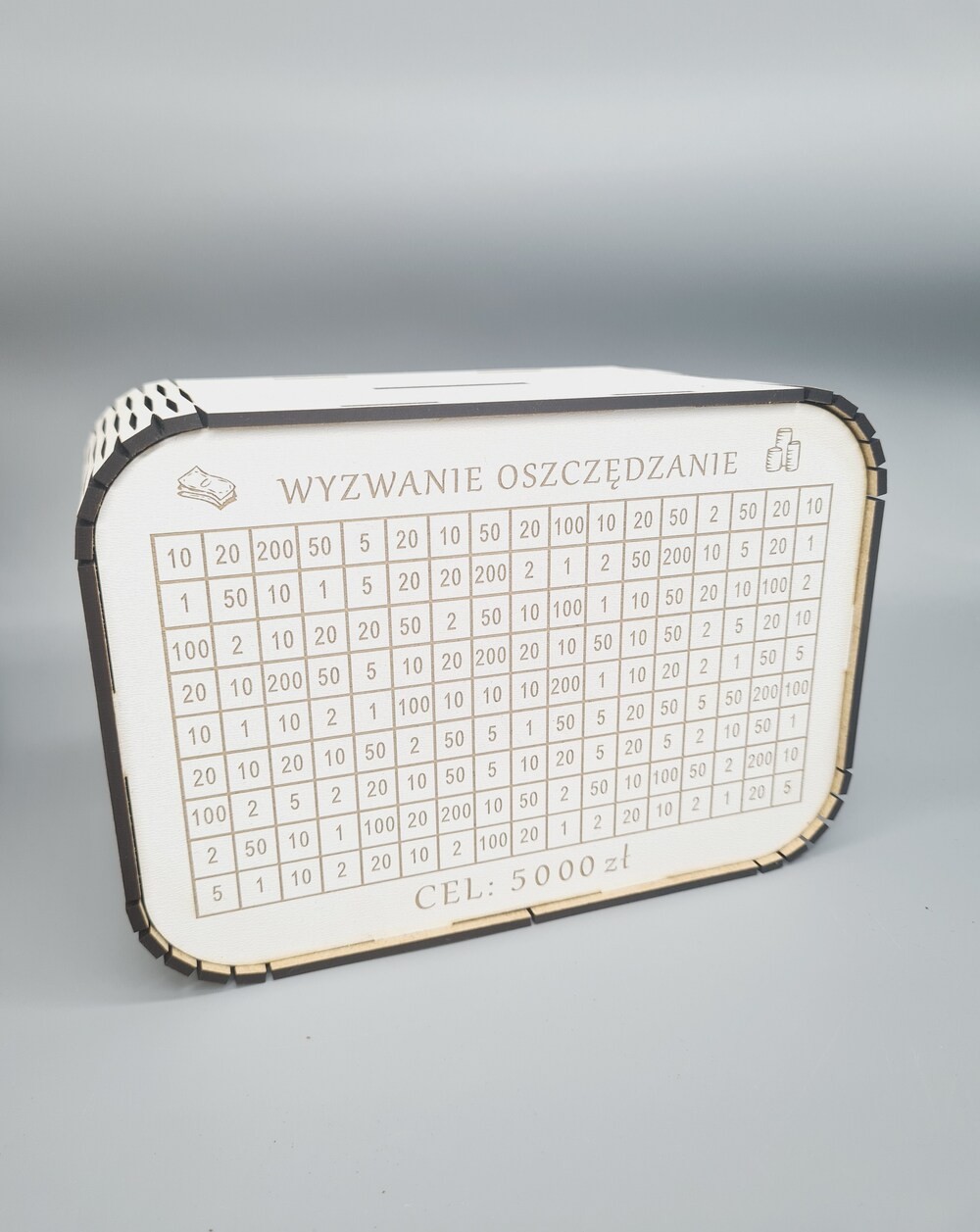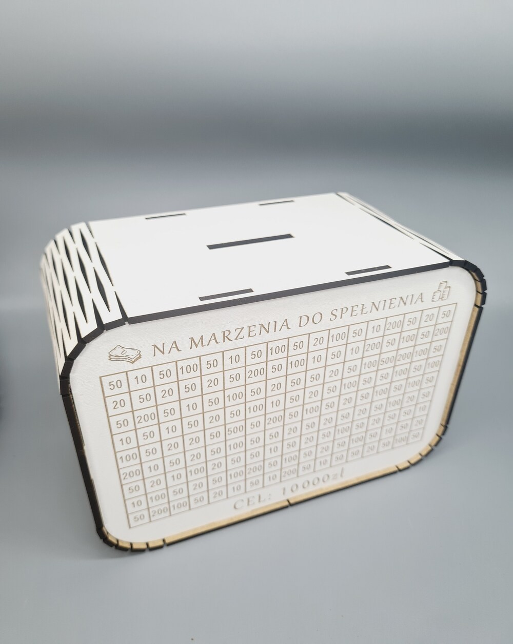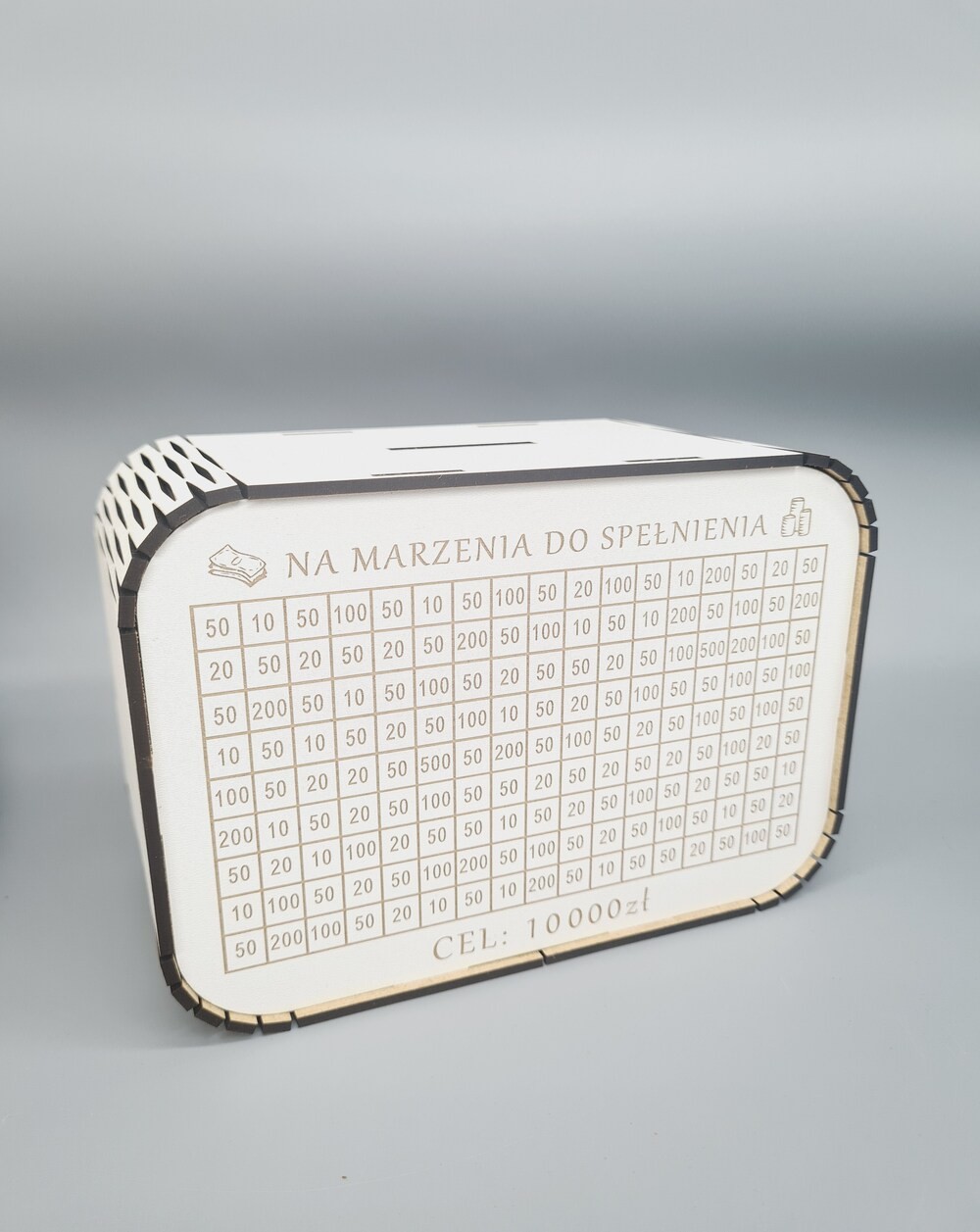 Skarbonka „Wykreślanka” wykonana z płyty HDF (18,5 cm x 13,5 cm x 10 cm) to idealne rozwiązanie dla osób, które chcą konsekwentnie oszczędzać Posiada personalizowany grawer z napisem i określoną kwotą celu, a efekt „wykreślanki” pozwala na śledzenie postępów w oszczędzaniu w kreatywny sposób.