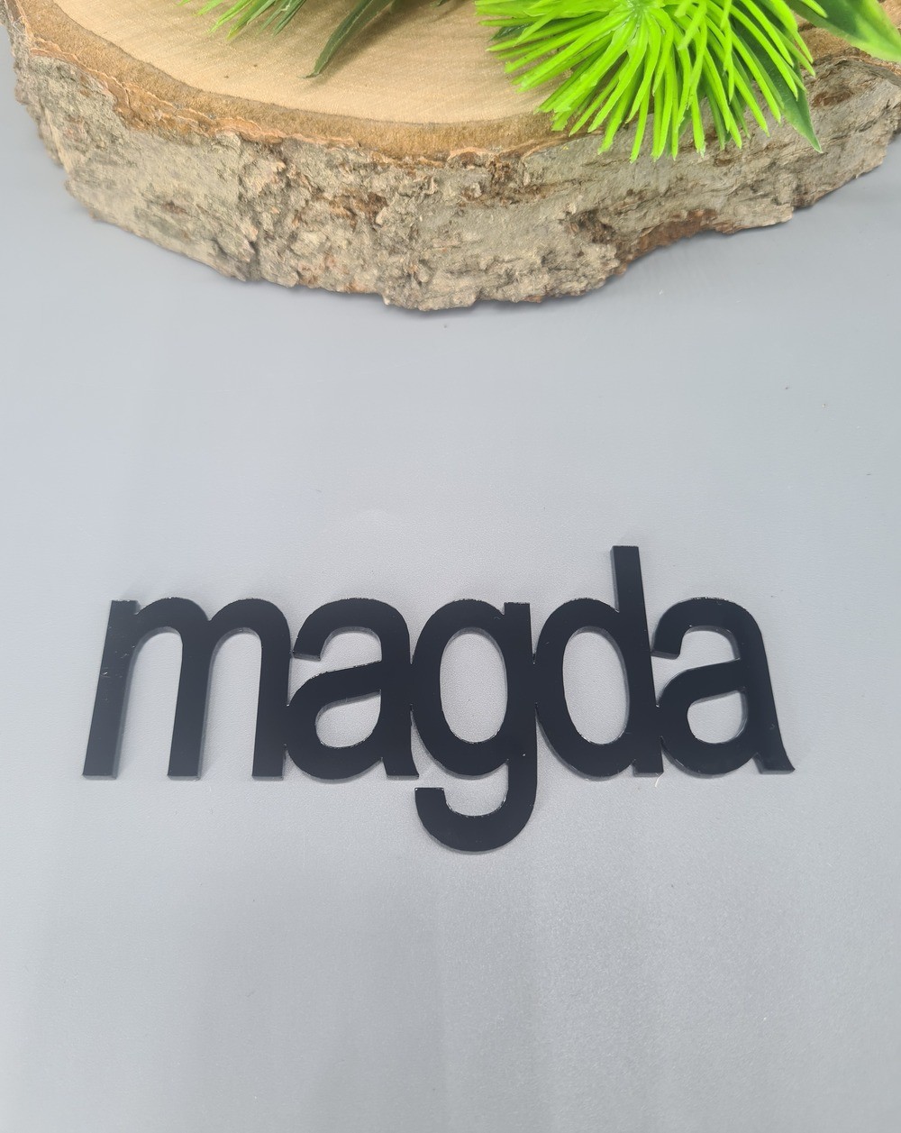 Topper na bok tortu z imieniem to wyjątkowa dekoracja, która doda elegancji każdemu wypiekowi. Prezentowany model został wykonany z czarnej plexi, jednak istnieje możliwość wyboru innych wariantów kolorystycznych, takich jak złota, srebrna i biała plexi, a także naturalna drewniana sklejka.