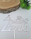 Jego wymiary to około 15 cm x 11 cm, a dodatkowa nóżka o długości 7,5 cm umożliwia łatwe umieszczenie w torcie. Prezentowany na zdjęciu w srebrnej plexi, ale dostępny także w wersji złotej, czarnej, białej lub wykonany z naturalnej drewnianej sklejki.