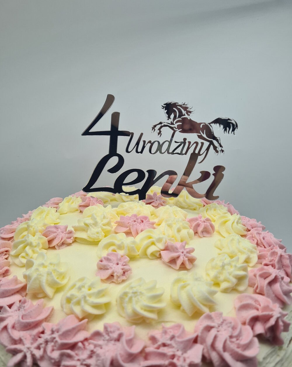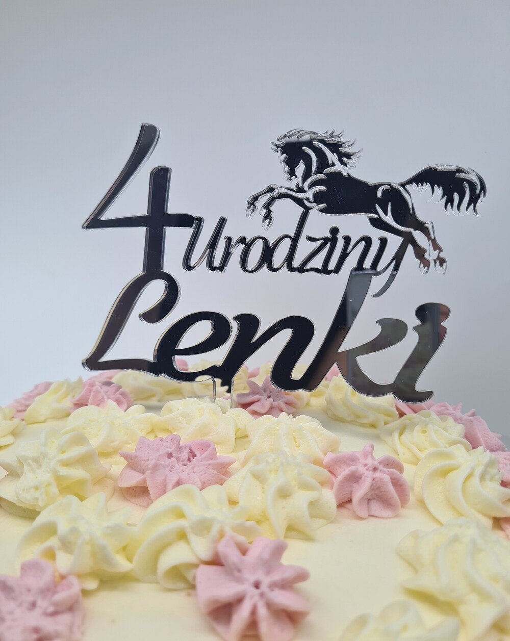 Personalizowany topper na tort z konikiem to elegancka ozdoba urodzinowa, zawierająca imię, wiek oraz sylwetkę konia, idealna dla miłośników jeździectwa. Wykonany z wysokiej jakości plexi (srebrnej, złotej, czarnej, białej) lub drewnianej sklejki, dodaje wyjątkowego uroku każdemu tortowi.