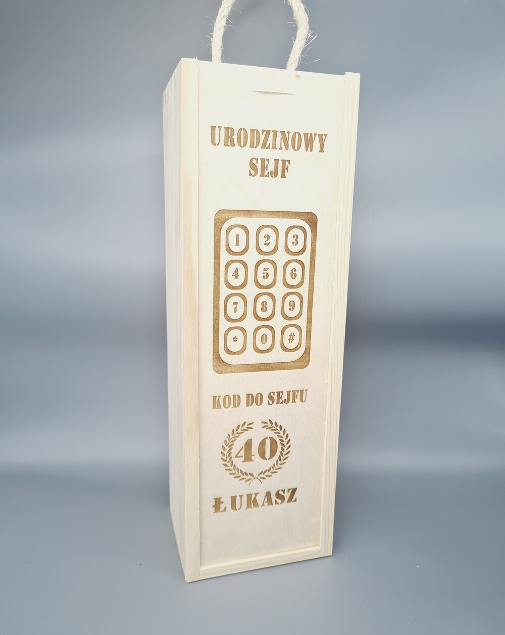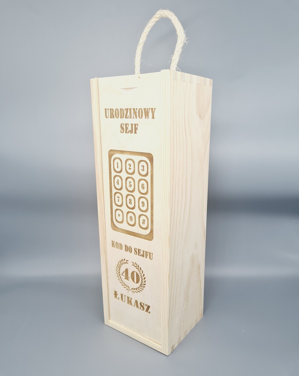 Drewniana skrzynka na wino o wymiarach 35 × 11 × 10 cm z rączką ze sznurka to zabawny i oryginalny prezent urodzinowy. Jej front zdobi grafika imitująca sejf oraz personalizowany napis „Kod dostępu: [wiek] + [imię solenizanta]”, co dodaje humorystycznego charakteru i czyni upominek wyjątkowym.