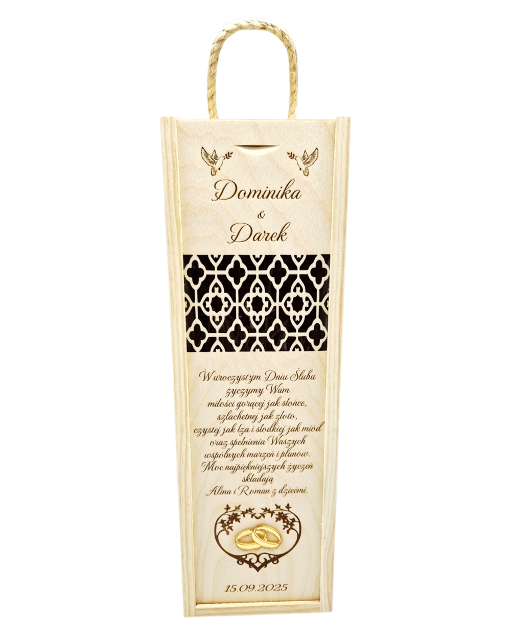 Nie zapomnij zapisać swojej personalizacji, aby móc dodać ją do koszykaPrzedstawiamy ekskluzywną drewnianą skrzynkę na wino, zaprojektowaną z myślą o wyjątkowym dniu ślubu. To elegancki prezent, który łączy w sobie elegancję, personalizację i głębokie życzenia, tworząc niezapomnianą pamiątkę dla Pary Młodej. Taka drewniana skrzynka łączy w sobie estetykę, funkcjonalność i emocjonalną wartość. Personalizacja imionami Pary Młodej, delikatne grafiki, ażurowe akcenty oraz piękne życzenia sprawiają, że skrzynka staje się niezapomnianą pamiątką z dnia ślubu. Wybierając tę skrzynkę, dajesz prezent, który wywoła wzruszenie i radość. Jest to idealny sposób na wyrażenie najgłębszych życzeń dla nowożeńców, które będą im towarzyszyć przez całe wspólne życie. Eleganckie serce z obrączkami ze złotej plexi dodaje luksusowego charakteru, czyniąc skrzynkę jeszcze bardziej wyjątkową.