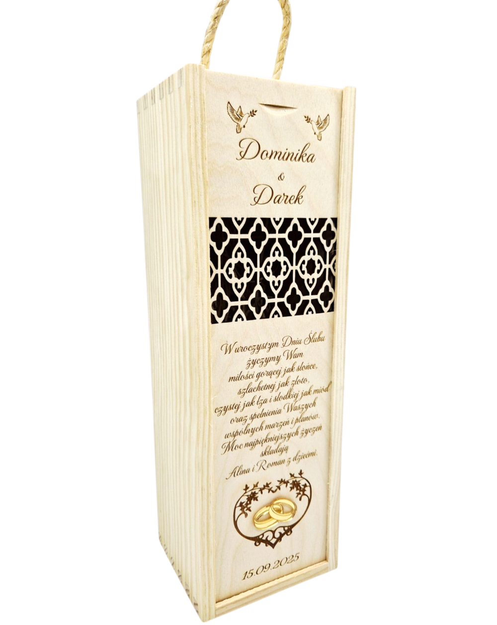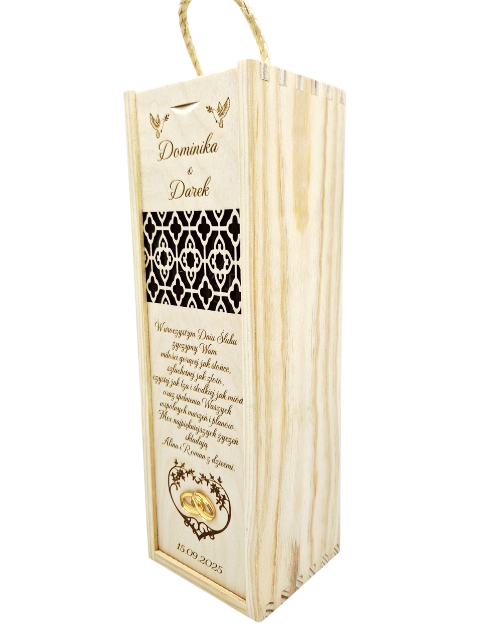 - Personalizacja: na górze skrzynki znajdują się imiona nowożeńców, co sprawia, że prezent jest unikalny i spersonalizowany.