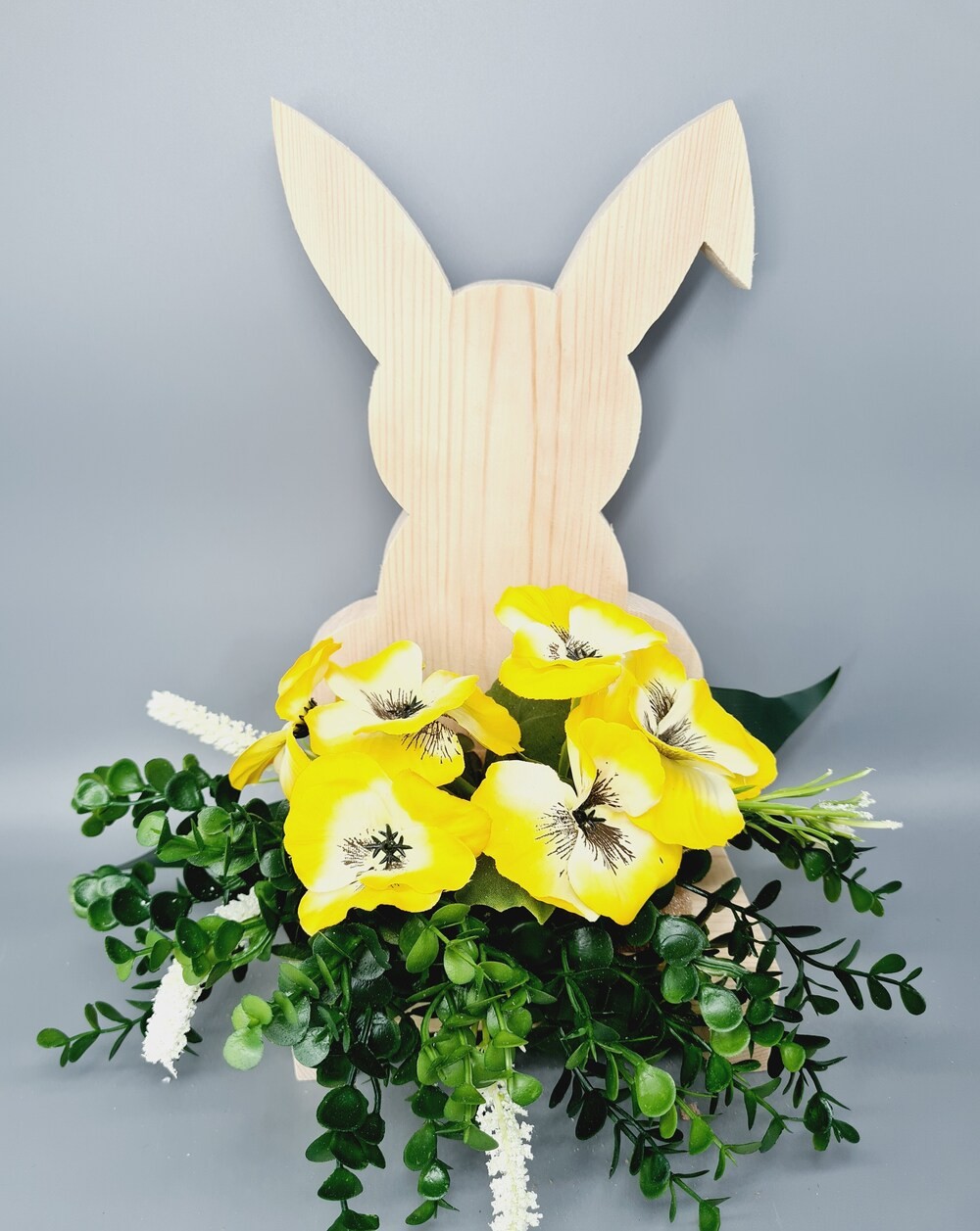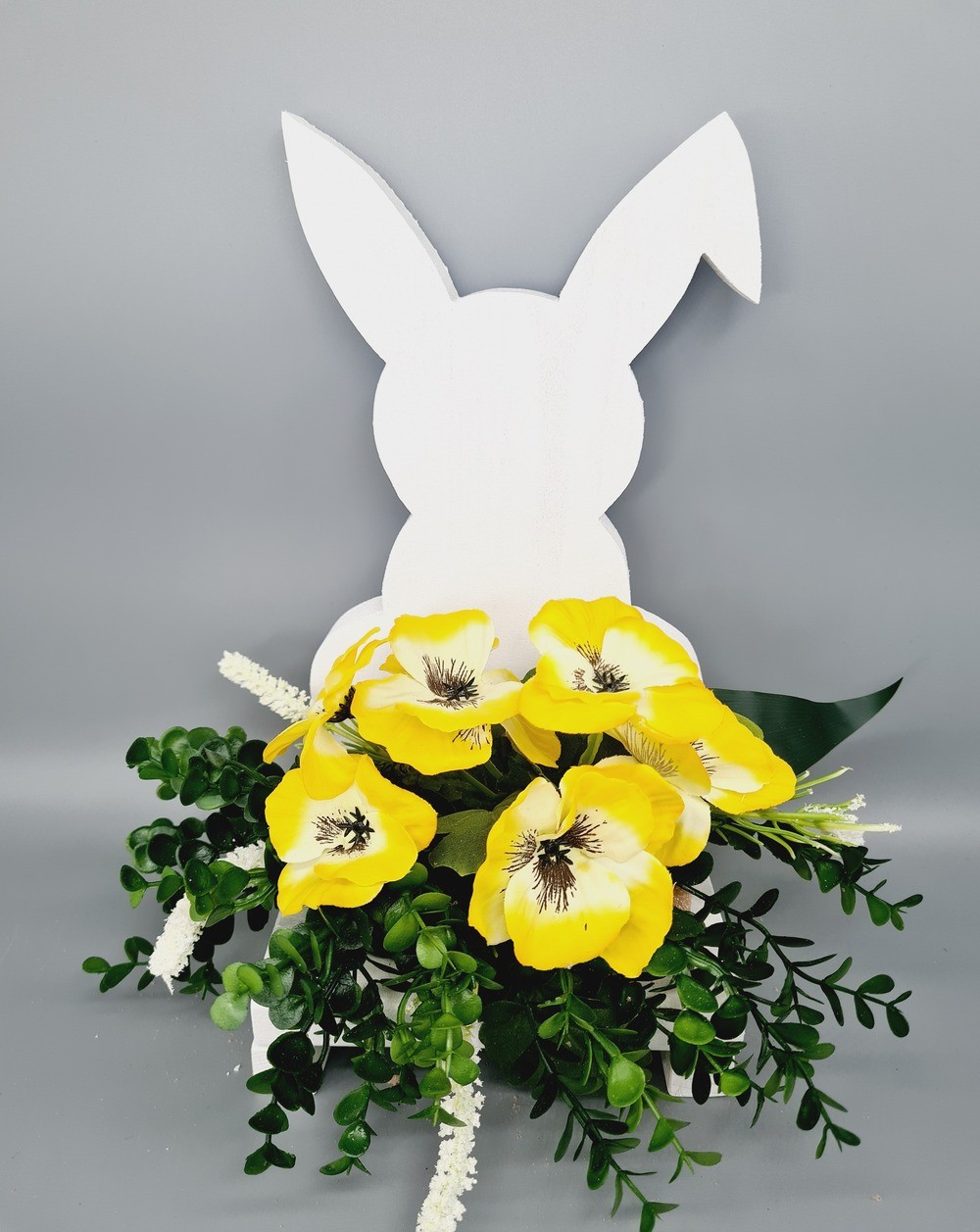 Elegancki drewniany stroik wielkanocny z bratkami i bukszpanem to piękna dekoracja na święta, idealna do domu lub jako stroik na grób. Ozdoba składa się z drewnianego zająca (29 cm x 14,5 cm) na podstawce, dostępnego w wersji naturalnego drewna lub białej, co pozwala dopasować ją do własnych upodobań.