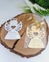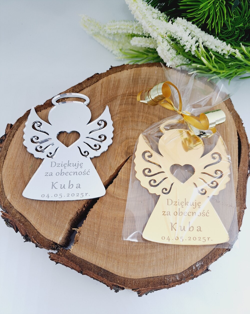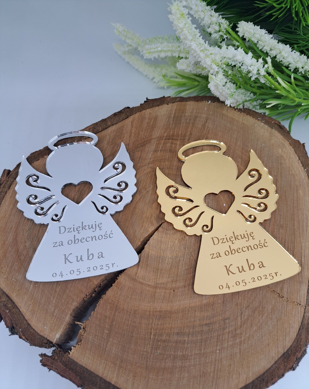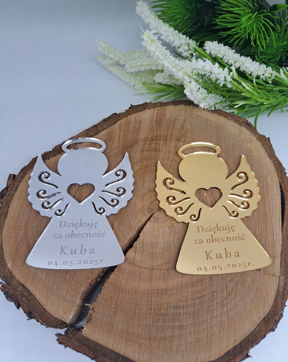 Elegancki aniołek z lustrzanej plexi w kolorze srebrnym lub złotym (o wysokości 10 cm i szerokości 7 cm) z grawerem "Dziękuję za obecność (Imię i data)" to piękny upominek dla gości. Dodatkowo, dzięki magnesowi z tyłu, można go łatwo przymocować do lodówki, co czyni go nie tylko ozdobą, ale i praktycznym przypomnieniem o wspólnych chwilach.