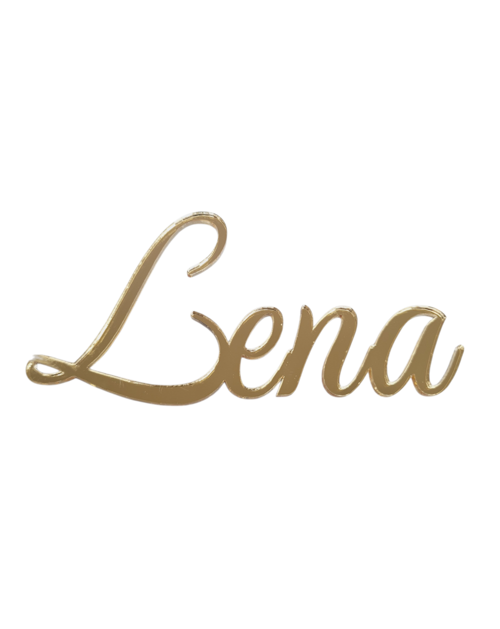 Topper na tort wykonany z plexi lub drewnianej sklejki, dostępny w kolorach: złotym, srebrnym, białym, czarnym oraz naturalnym drewnie. Ma wysokość pierwszej litery 5 cm, szerokość 10-12 cm (w zależności od imienia) i jest bez szpikulca, przeznaczony do umieszczenia na boku tortu.