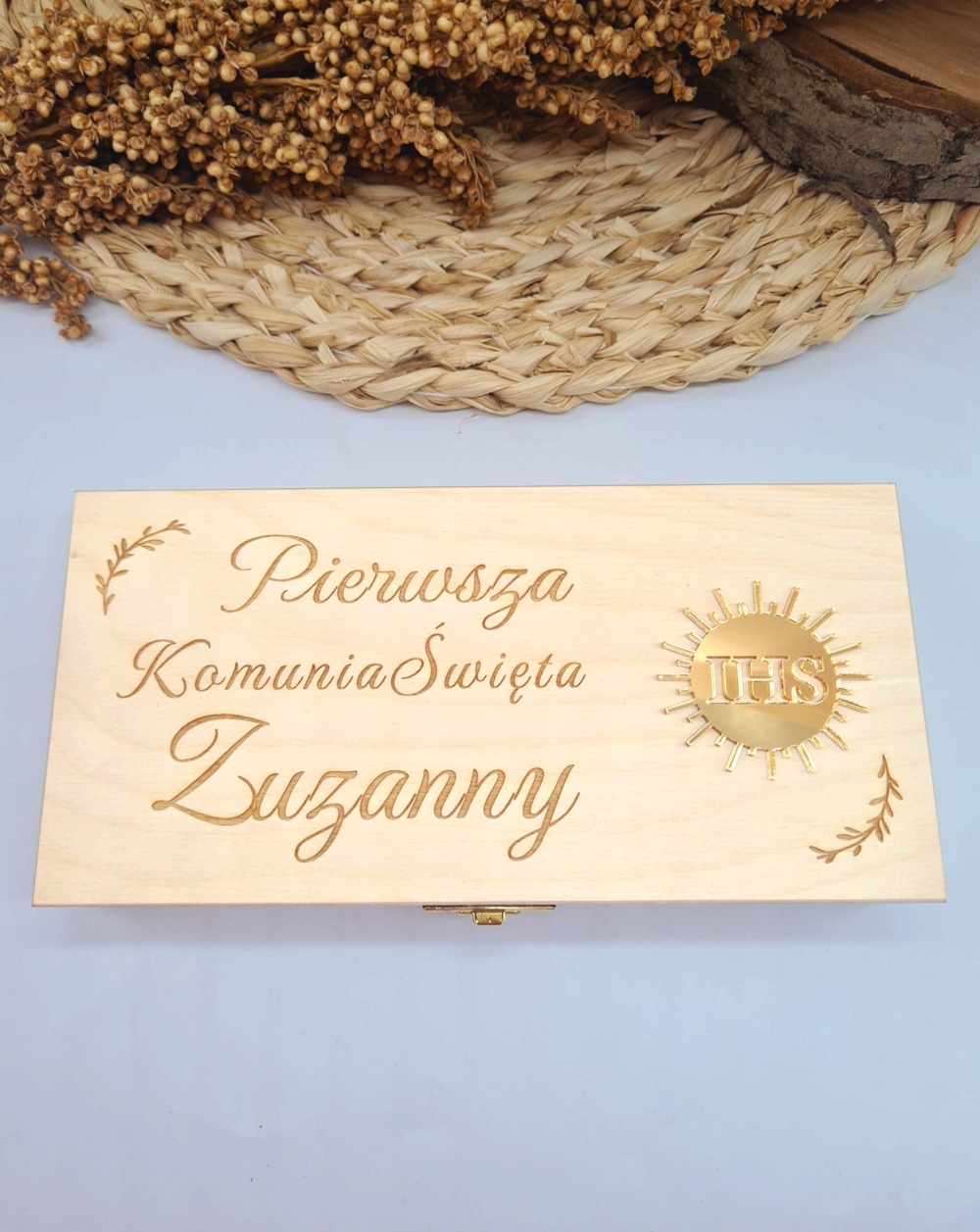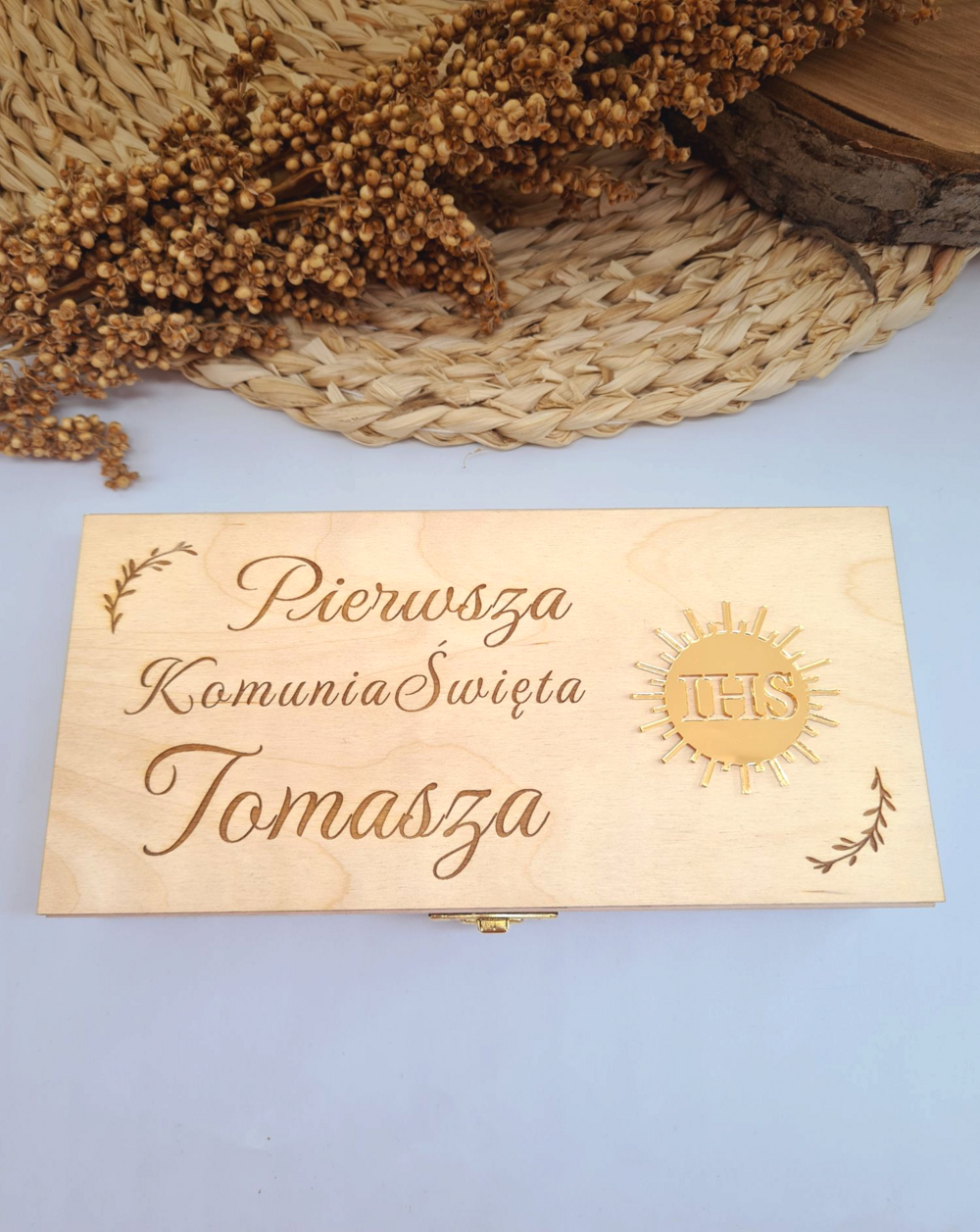 Eleganckie drewniane pudełko na pieniądze o wymiarach 20 × 10,5 × 3,5 cm to wyjątkowa pamiątka Pierwszej Komunii Świętej, z wygrawerowanym napisem oraz imieniem dziecka na froncie. Całość zdobi błyszczący akcent z plexi w formie doklejonej hostii z precyzyjnie wyciętym symbolem IHS pośrodku, a wewnątrz znajduje się wzruszająca dedykacja.