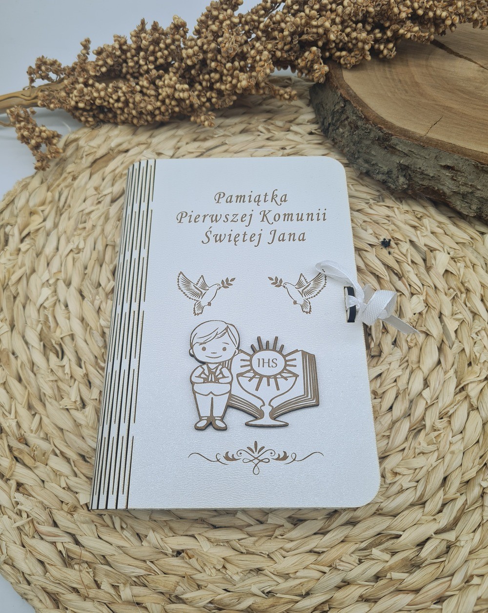 Na przedniej stronie znajduje się dekoracyjna aplikacja przedstawiająca chłopca, kielich, Pismo Święte oraz hostię z napisem "IHS", co nadaje całości głęboko religijny i uroczysty charakter. Całość dopełnia elegancki napis "Pamiątka Pierwszej Komunii Świętej" oraz imię dziecka, co sprawia, że upominek zyskuje osobisty wymiar.
