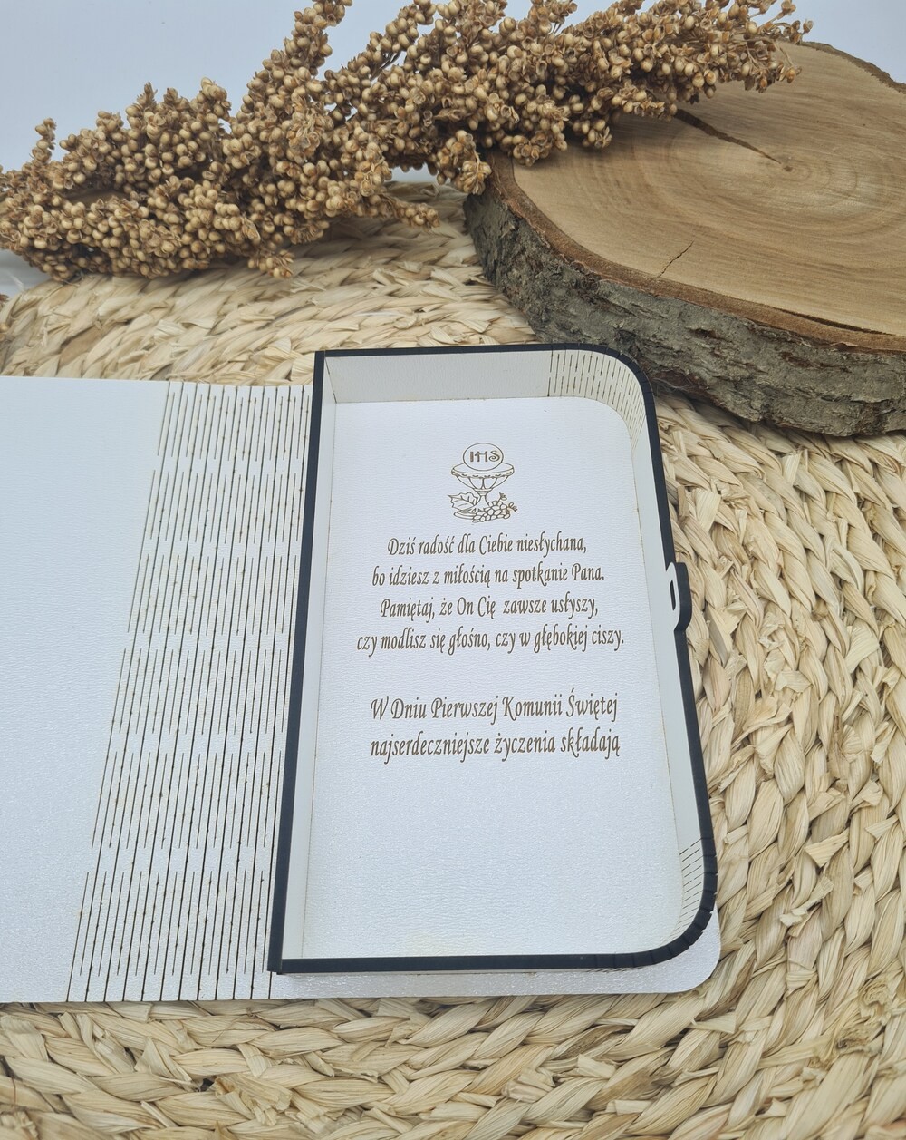 Nie zapomnij zapisać swojej personalizacji, aby móc dodać ją do koszykaElegancka pamiątka Pierwszej Komunii Świętej w formie pudełka na pieniądze lub czekoladę to wyjątkowy upominek, który doskonale łączy symbolikę z praktycznym zastosowaniem. Wykonane z solidnej płyty HDF o wymiarach 18,5 x 12 x 2,8 cm, pudełko zachwyca starannym wykonaniem i dbałością o detale.