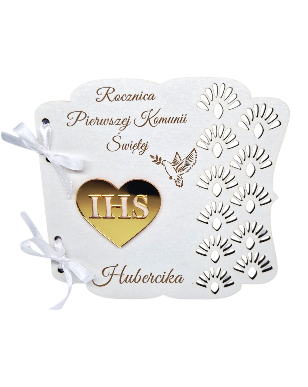 Kartka wykonana z trwałej płyty HDF, ozdobiona bocznym, ażurowym wzorem. Na froncie znajduje się serduszko ze złotej plexi z wyciętym napisem IHS, podkreślające jej sakralny charakter.