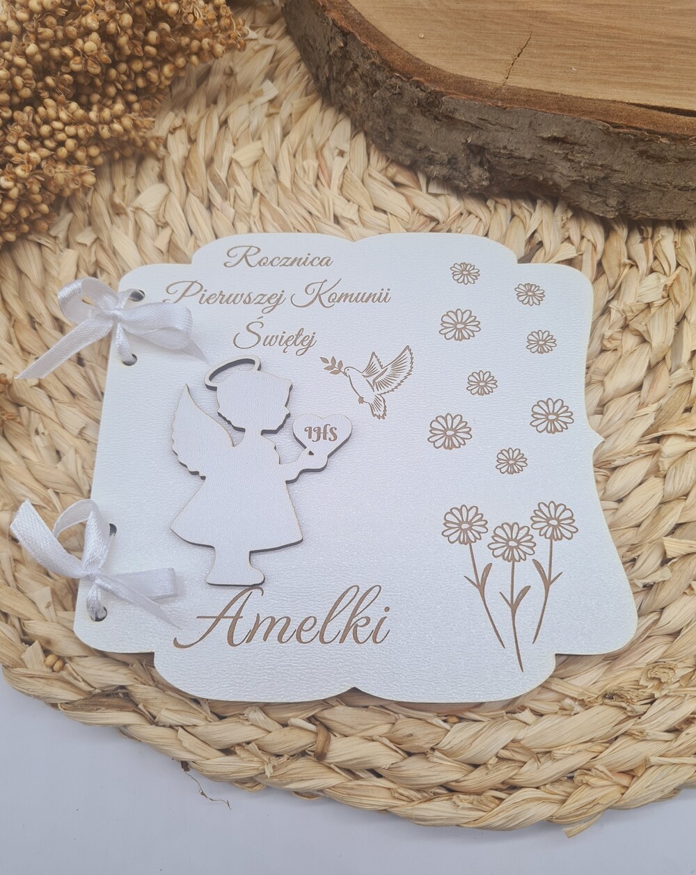 Po prawej stronie znajdują się delikatnie wygrawerowane stokrotki, symbolizujące czystość i niewinność. Po lewej umieszczony jest wizerunek anioła oraz grawerowany napis: „Rocznica Pierwszej Komunii Świętej” wraz z imieniem dziecka, co nadaje całości osobisty charakter. W środku znajduje się miejsce na życzenia, które można również spersonalizować.