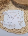 Elegancka pamiątka na Rocznicę Pierwszej Komunii Świętej wykonana z białej płyty HDF (14x14 cm), zdobiona grawerowanymi stokrotkami, aniołem, imieniem dziecka i napisem, zawiera życzenia w środku, ma dwie strony połączone wstążeczką i jest zapakowana w kopertę.