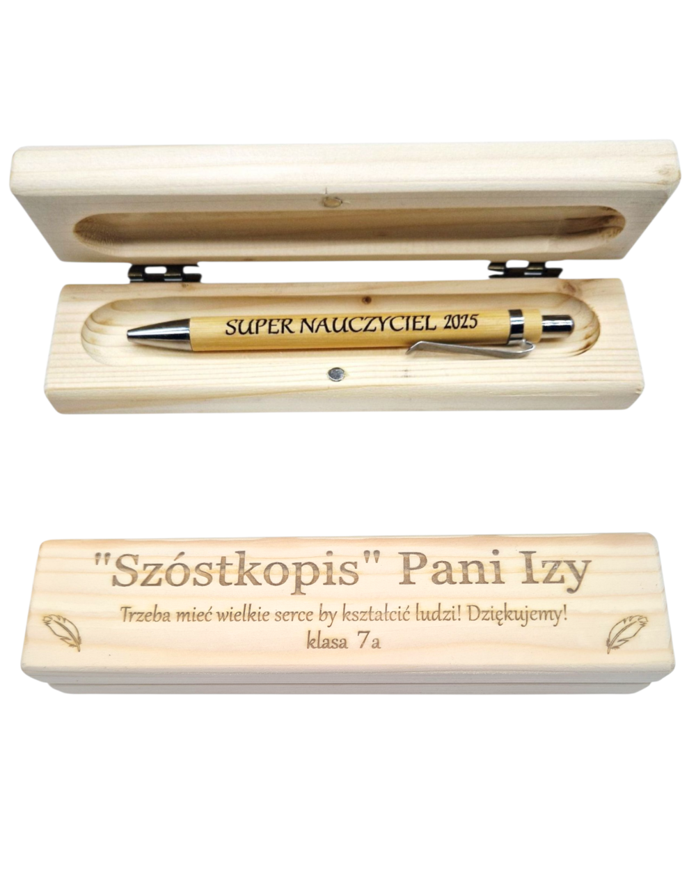 Personalizowany długopis z dowolnym grawerem, zapakowany w pachnące naturalnym drewnem pudełko z humorystycznym napisem „Szóstkopis” i imieniem nauczycielki oraz sentencją „Trzeba mieć wielkie serce, by kształcić młodych ludzi”, to wyjątkowy i pełen wdzięczności prezent, idealny na zakończenie roku szkolnego lub inną okazję.