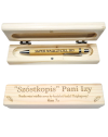 Nie zapomnij zapisać swojej personalizacji, aby móc dodać ją do koszykaElegancki, personalizowany długopis w drewnianym pudełku to wyjątkowy prezent, który doskonale sprawdzi się jako wyraz wdzięczności dla nauczyciela, wychowawcy lub pedagoga. Długopis wykonany jest z wysokiej jakości materiałów i ozdobiony subtelnym, trwałym grawerem – możesz umieścić na nim dowolny krótki napis, taki jak „Dziękujemy”, „Najlepszy Wychowawca” czy imię klasy. To drobny, ale znaczący detal, który czyni upominek osobistym i wyjątkowym.
