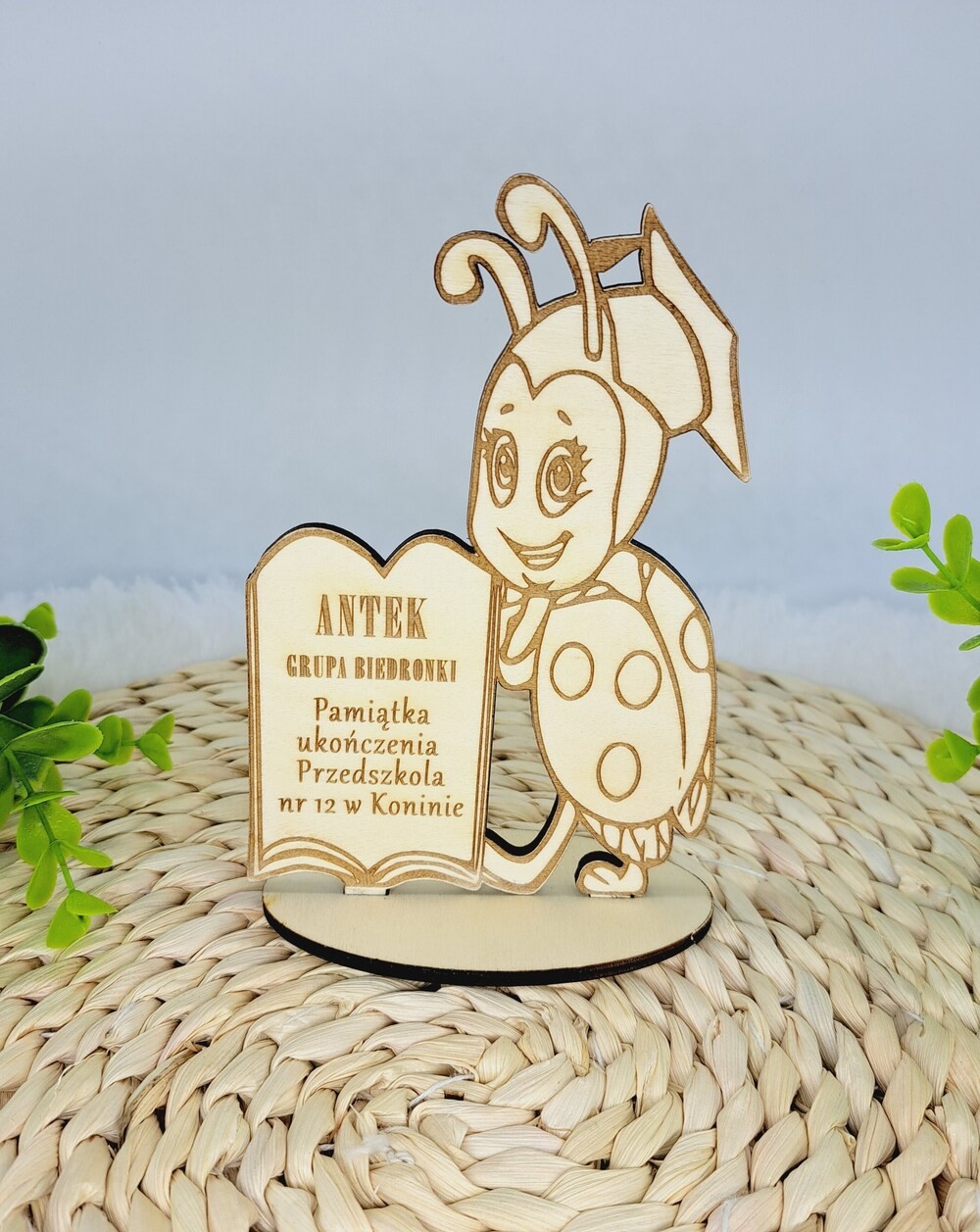 Nie zapomnij zapisać swojej personalizacji, aby móc dodać ją do koszykaUrocza statuetka w kształcie biedronki trzymającej księgę, wykonana z wysokiej jakości drewnianej sklejki o wymiarach około 15 x 9,5 cm, to doskonały upominek dla dzieci z okazji zakończenia przedszkola.