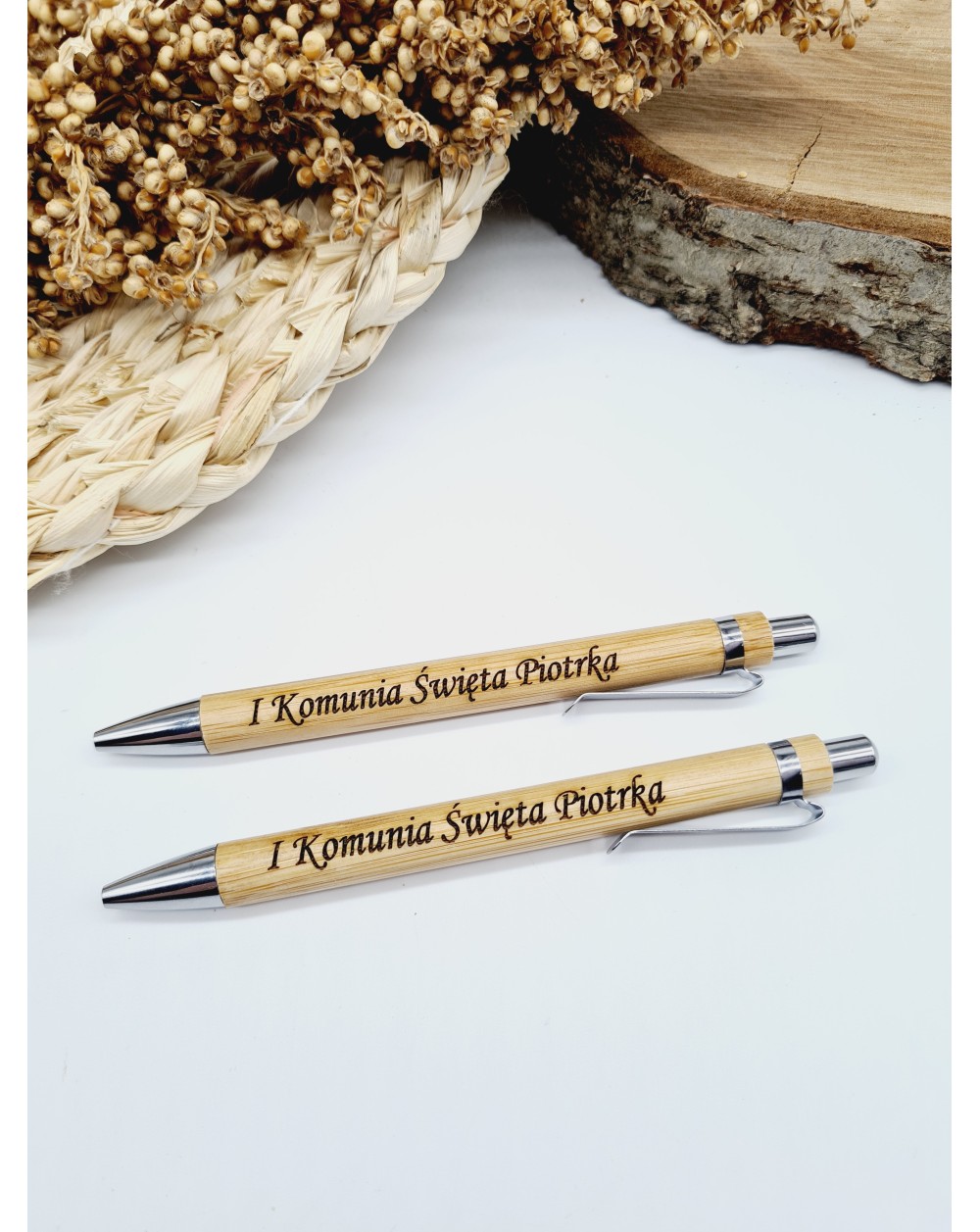 Elegancki długopis wykonany z naturalnego drewna bambusowego z możliwością personalizacji krótkim grawerem (np. „I Komunia Święta – Antek”); treść graweru należy wpisać w polu „Dostosowanie”.