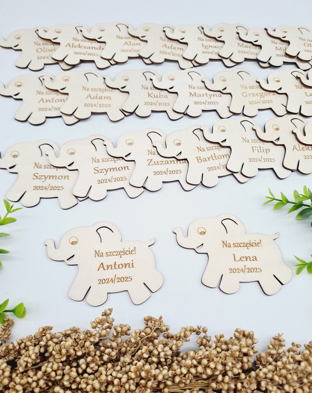 Drewniany magnes w kształcie słonika wykonany ze sklejki z grawerem (np. „Na szczęście” lub imieniem) to uroczy, personalizowany upominek na zakończenie szkoły lub inną uroczystość, przy czym treść graweru powinna być krótka i czytelna ze względu na ograniczoną powierzchnię (wymiary: 7,5 cm wysokości na 9,5 cm szerokości).
