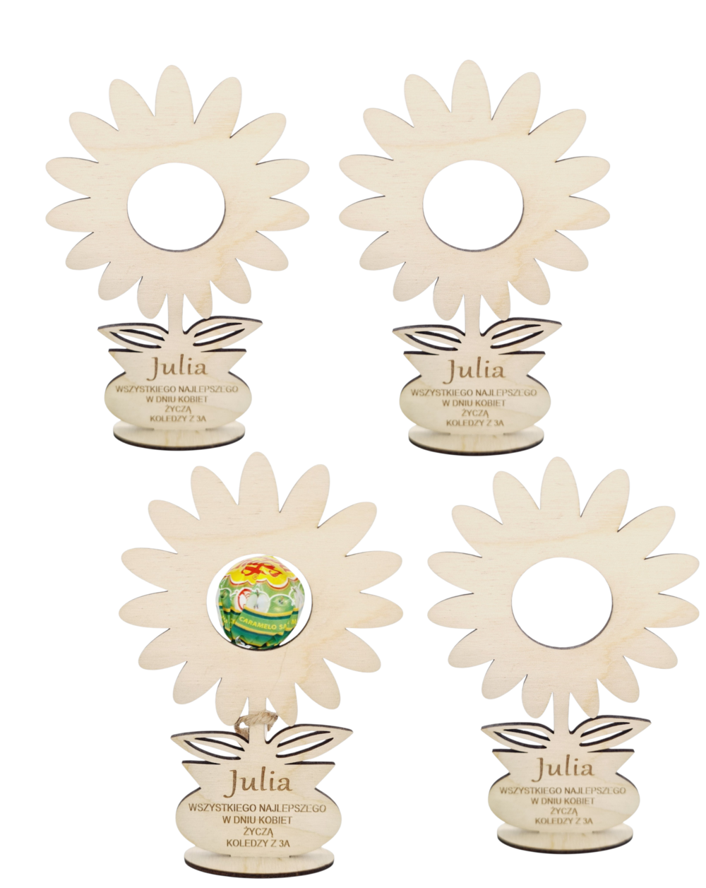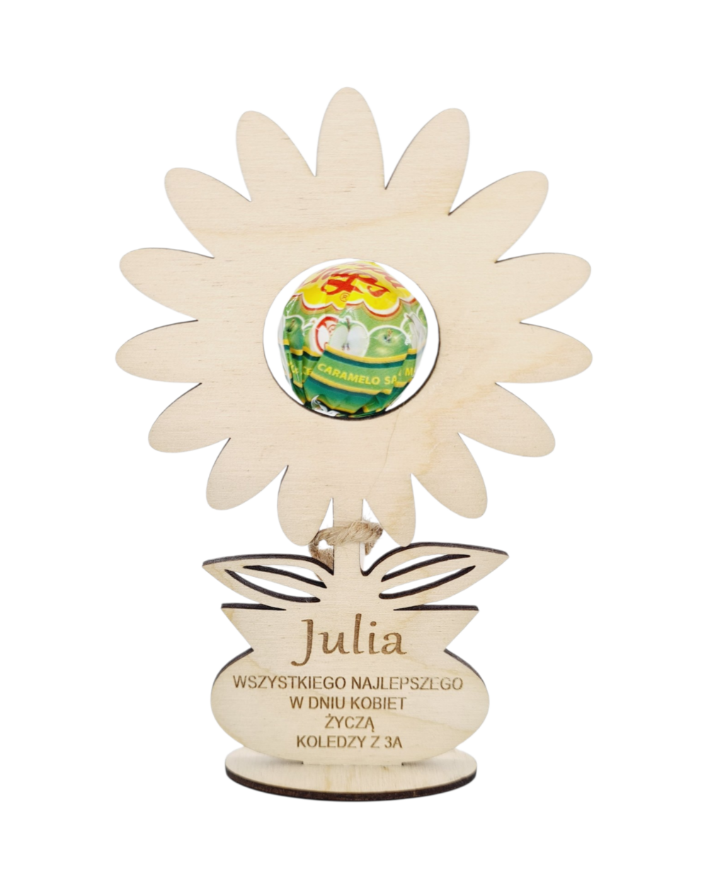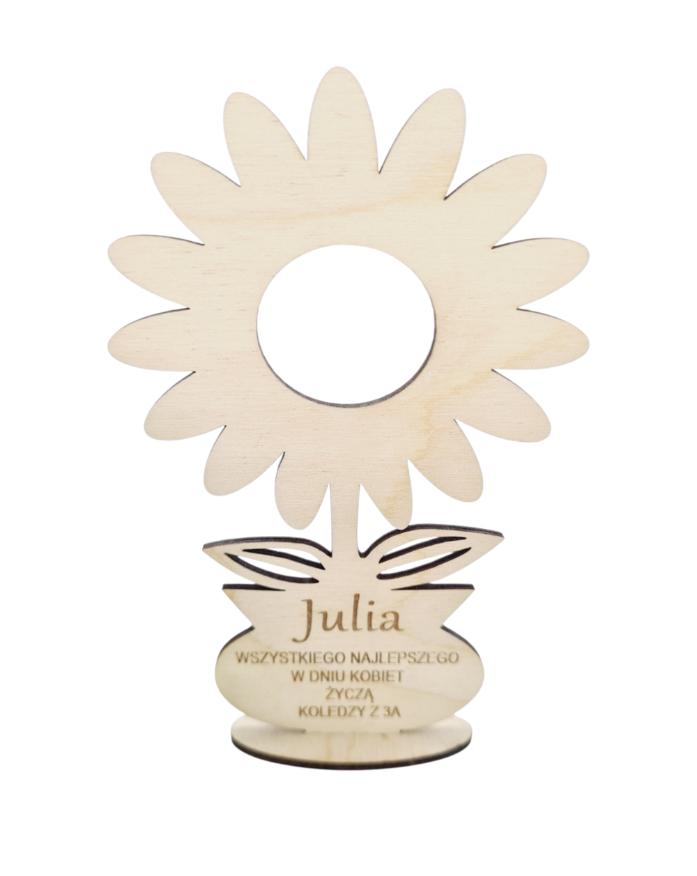 Nie zapomnij zapisać swojej personalizacji, aby móc dodać ją do koszykaOryginalny drewniany kwiatek wykonany z wysokiej jakości drewnianej sklejki, który łączy funkcję upominku i dekoracji. Kwiatek ma wymiary 13 x 8 cm i stoi na stabilnej podstawce, dzięki czemu po wręczeniu można go ustawić np. na półce czy biurku.