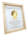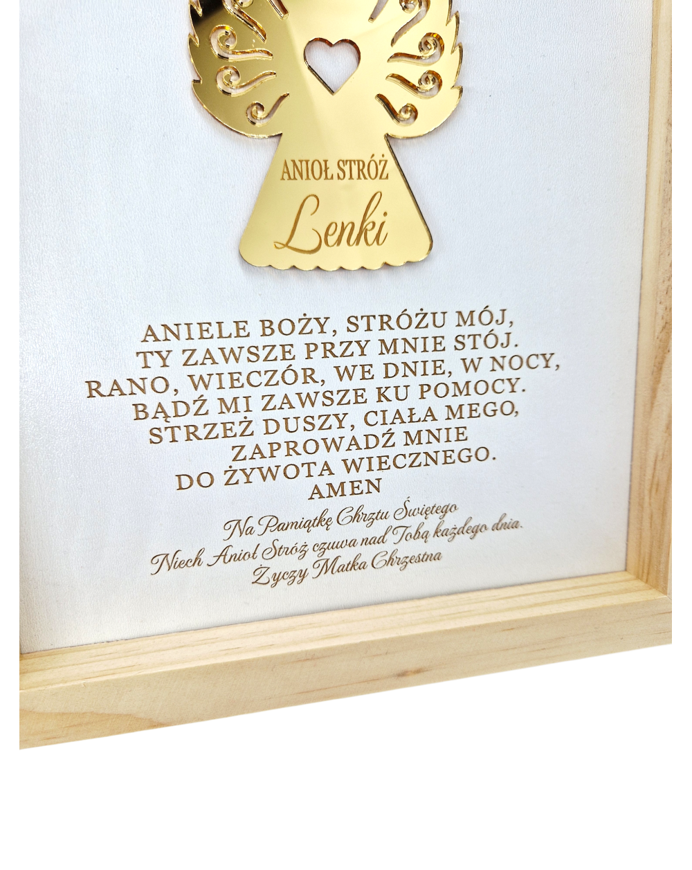 Elegancka pamiątka Chrztu Świętego w ramce 22,5x27,5 cm z grawerowanym napisem, aniołkiem z plexi z imieniem dziecka, modlitwą „Aniele Boży, Stróżu mój…” oraz podpisem osoby wręczającej.