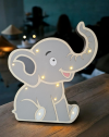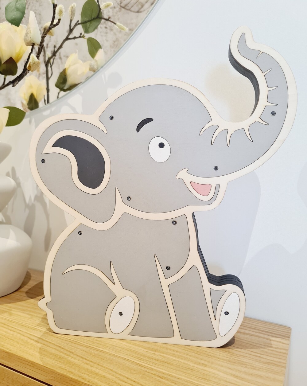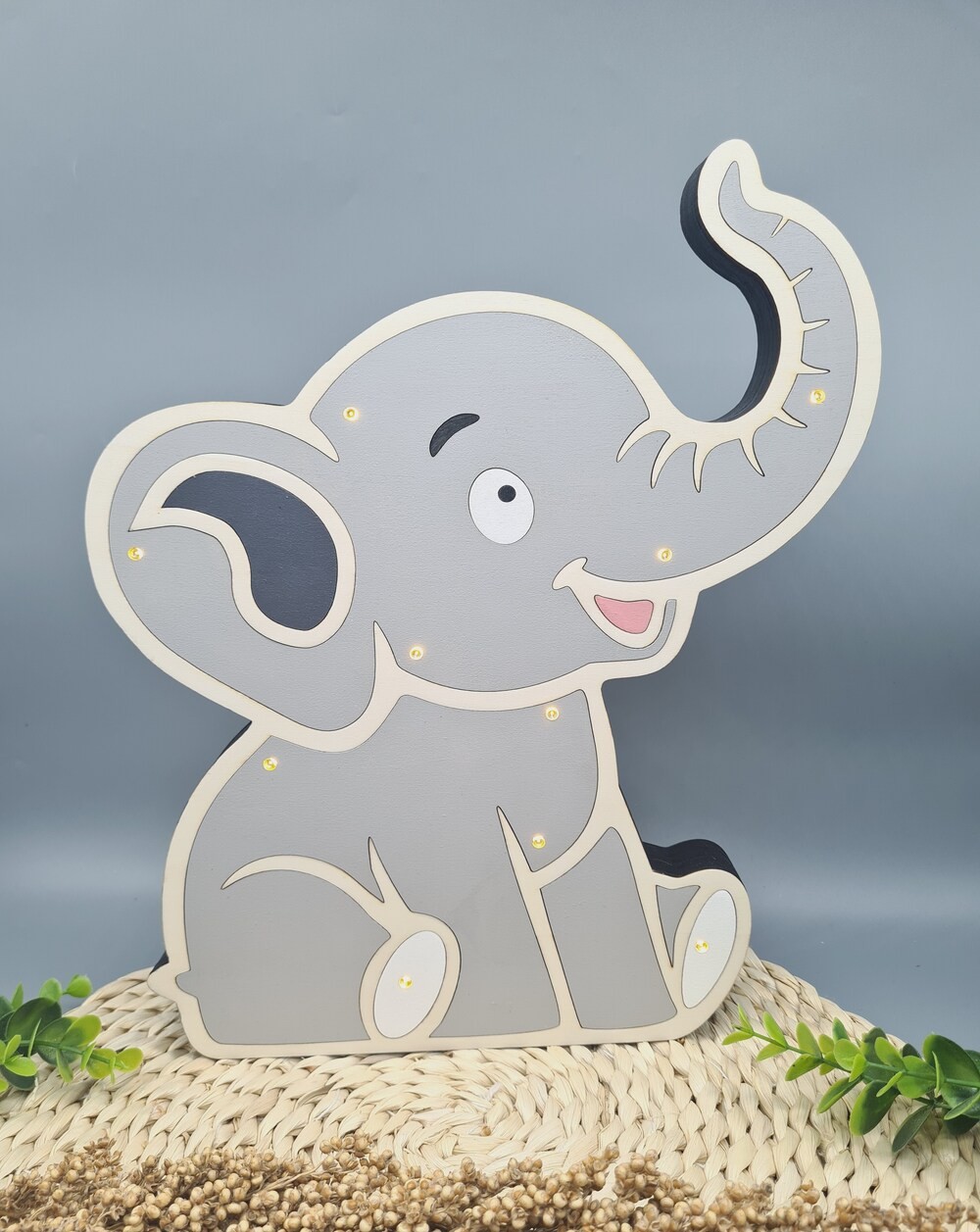 Urocza lampka nocna w kształcie słonika, malowana bezpiecznymi dla dzieci farbami, emituje delikatne światło z 10 diod LED, działa na 2 baterie AA (bez kabla), ma wymiary 36 × 28,5 cm, świetnie sprawdzi się jako prezent, a wykonana jest z drewnianej sklejki i płyty HDF. Cena obejmuje lampkę bez baterii.