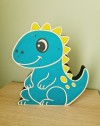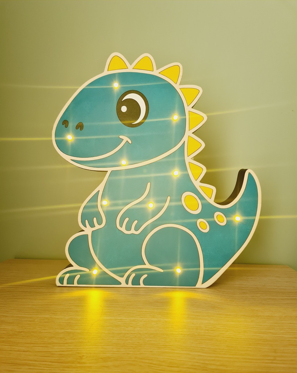Urocza lampka nocna w kształcie dinozaura, wykonana ze sklejki i płyty HDF, bezpieczna dla dzieci, zasilana na baterie, świeci delikatnym światłem 10 diod LED i nadaje się do postawienia lub powieszenia na ścianie