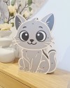 Ręcznie malowana lampka nocna w kształcie kota, wykonana ze sklejki i płyty HDF, bezpieczna dla dzieci, zasilana na baterie (bez kabla), idealna do postawienia lub powieszenia, ma wymiary 33 × 24 cm i nadaje się do zabrania w każde miejsce.